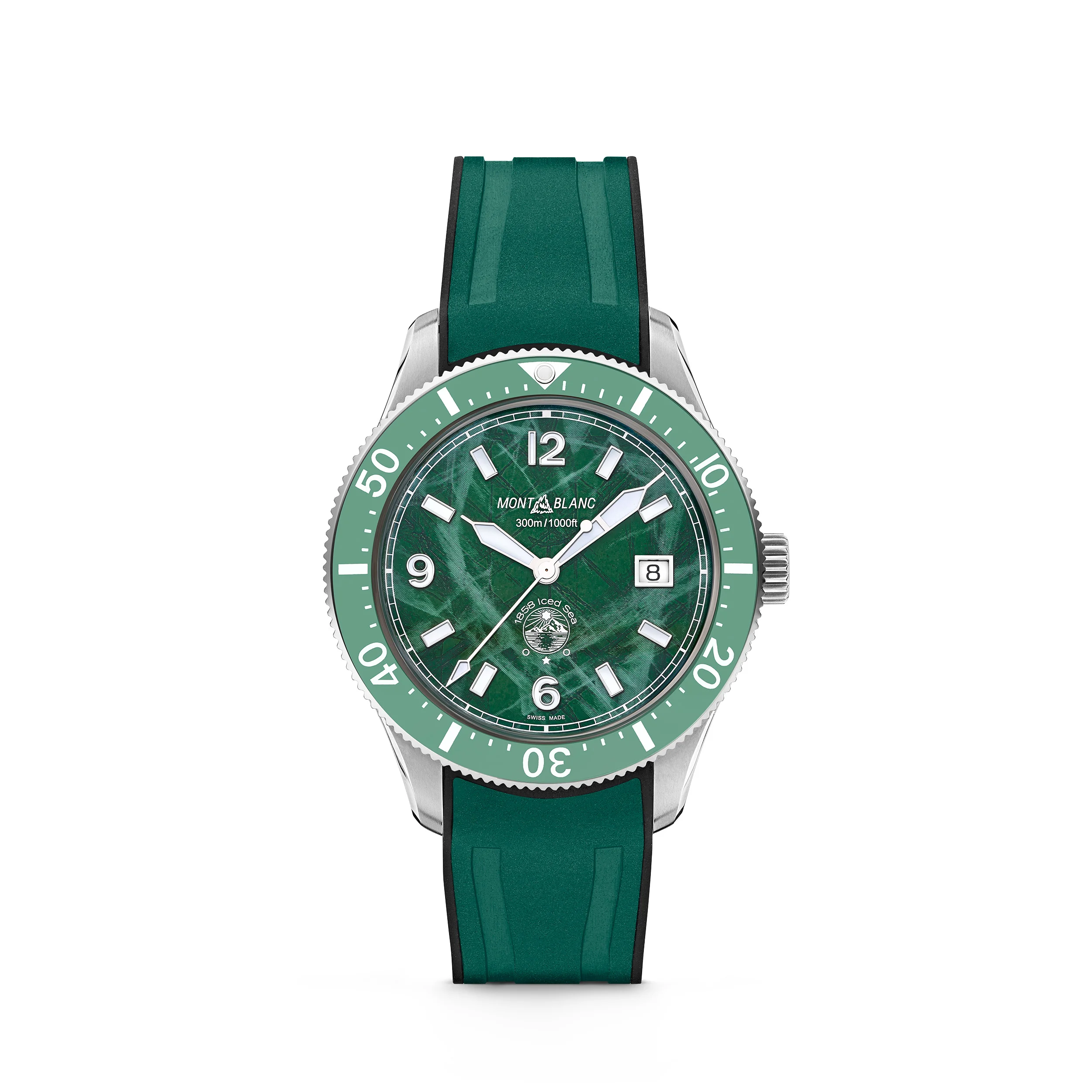 The first-ever sports diving watch for Montblanc, the Montblanc Iced Sea Automatic Date features a glacier pattern dial that gives the impression of looking into the depths of a glacier. This green glacial pattern dial is inspired by the Mer de Glace - Sea of Ice - the main glacier of the Mont-Blanc Massif. Its texture was achieved using an almost-forgotten ancestral technique called gratte-boise. The timepiece is housed in a 41mm stainless steel case and comes with a unidirectional bi-colour ceramic bezel, an engraved case back, and an interchangeable black rubber strap with fine adjustment system. The timepiece conforms to the ISO 6425 norm for diving watches and is water-resistant to 300 metres. Ident No. MB129765 Movement CALIBER Automatic, self-winding MOVEMENT TYPE Automatic movement Hours - Minutes - Seconds - Date COMPLICATIONS Date by disc NUMBER OF JEWELS 26 Jewels Case CASE DIAMETER 1.61 inches CASE HEIGHT 0.51 inches WATER RESISTANT 30 bar (300 m) bar BEZEL Unidirectional rotating bezel BEZEL MATERIAL Steel - Ceramic SAPPHIRE CRYSTAL Domed glass box with anti-reflective coating CROWN Screwed and fluted in stainless steel with Montblanc emblem in relief DIAL Green glacier dial with white luminescent Arabic numerals