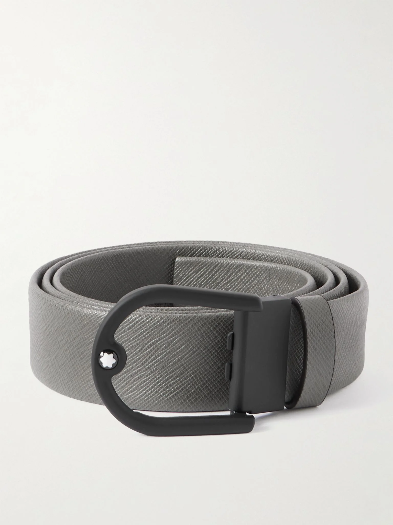 Montblanc's textured-leather belt features an embossed Saffiano pattern. It fastens with a rubberised PVC-coated horseshoe buckle and is accented with the house's star emblem. Details & Care - Grey textured-leather - Buckle fastening