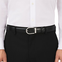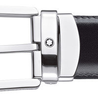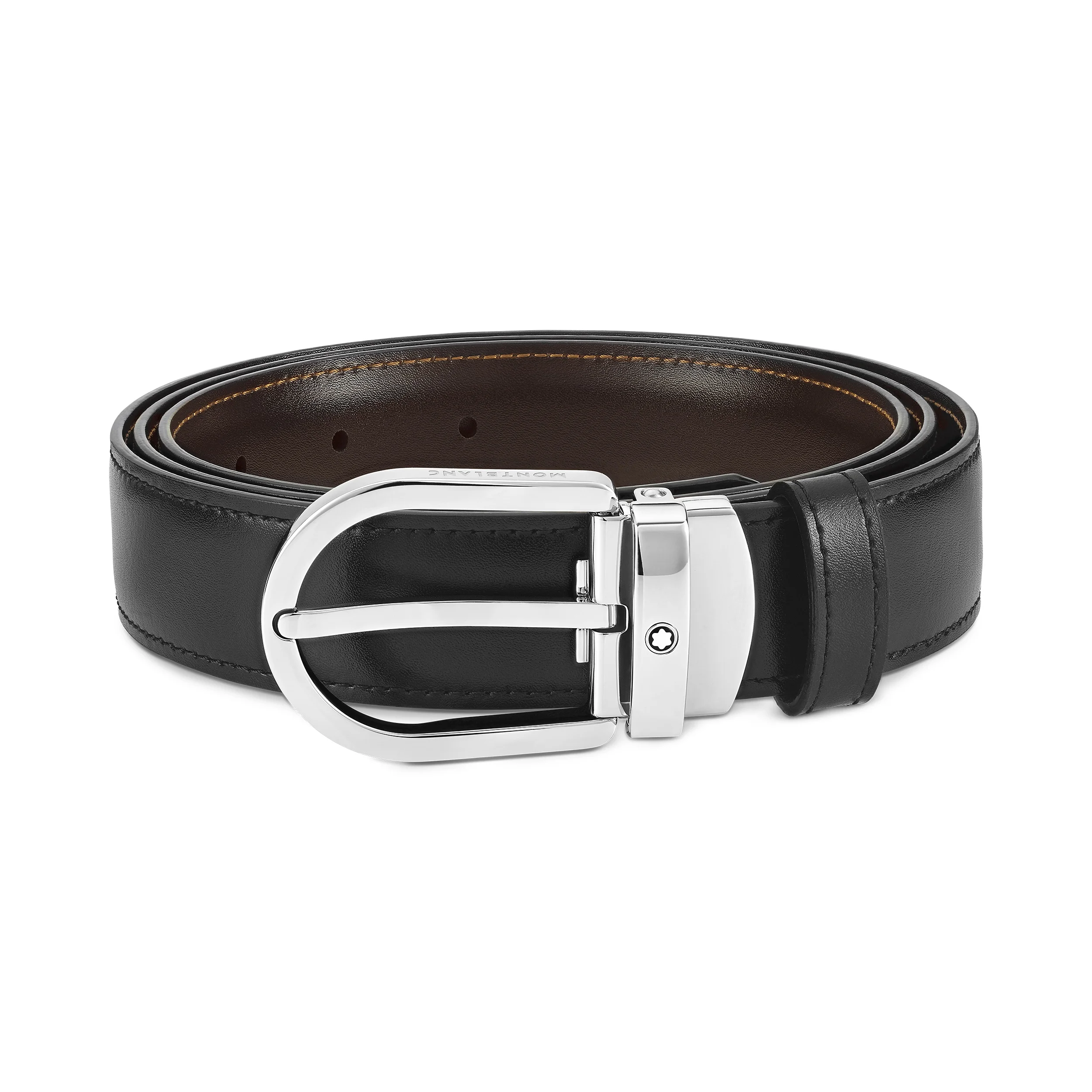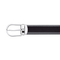 Shiny palladium-finish horseshoe pin buckle with engraved Montblanc brand name on the sides and Montblanc emblem. Self-adjustable, 3 cm x 120 cm, reversible black/brown leather strap. Refined and understated, for any kind of look. Ident No. MB128135 Material MATERIAL Calf-skin leather STRAP Reversible black and brown cowhide leather BUCKLE MECHANISM Easy-to-open mechanism to adjust strap length SHAPE Horseshoe COATING EMBLEM LOCATION Montblanc emblem on the metal loop COLOR Black | Brown Dimensions DIMENSIONS 47.24 × 1.18 × 0.20 inches FITTINGS / EMBLEM Emblems are manually centered, one by one, by our artisans. The emblem is centrally positioned, but the manual pressure operation with the machine may shift the emblem itself. This is a characteristic that does not compromise the aesthetic of the product and could not be accepted as complaint according to our policy.