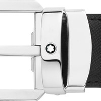 Trapeze shiny palladium-finish pin buckle with leather detail. Self-adjustable, 3 cm x 120 cm, reversible saffiano printed leather strap in black and brown. Conceived for a classic look with a twist. Ident No. MB128759 Material MATERIAL Cowhide STRAP Reversible black and brown Saffiano-printed leather strap BUCKLE MECHANISM Easy-to-open mechanism to adjust strap length SHAPE Trapeze COATING EMBLEM LOCATION Montblanc emblem on the metal loop COLOR Black | Brown Dimensions DIMENSIONS 47.24 × 1.18 × 0.20 inches FITTINGS / EMBLEM Emblems are manually centered, one by one, by our artisans. The emblem is centrally positioned, but the manual pressure operation with the machine may shift the emblem itself. This is a characteristic that does not compromise the aesthetic of the product and could not be accepted as complaint according to our policy.