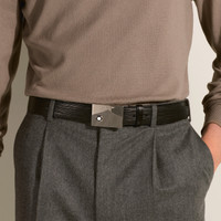 Tie any ensemble together with a trusted Montblanc style companion: a 3.5 cm x 120 cm luxurious black bark-print leather adorned with a bold rectangular Meisterstuck plate lock with a vintage palladium finishing that pays homage to the writing culture. A distinctive asymmetrically-positioned Montblanc emblem crowns the design. Ident No. MB199092 Material MATERIAL Calf-skin leather COLOR Black Dimensions DIMENSIONS 47.24 × 0.20 × 1.38 inches