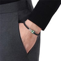 The piece of jewelry, woven from black leather, has a clasp made of polished stainless steel with one ring in steel with Montblanc emblem and two rings in green-colored resin. Ident No. MB129825 Material Material Stainless steel Physical Weight 12.21 g Colour Green Features Clasp Magnetic Dimensions Physical Weight 12.21 g Exportable Legal Notice Emblems are manually centered, one by one, by our artisans. The emblem is centrally positioned, but the manual pressure operation with the machine may shift the emblem itself. This is a characteristic that does not compromise the aesthetic of the product and could not be accepted as complaint according to our policy.
