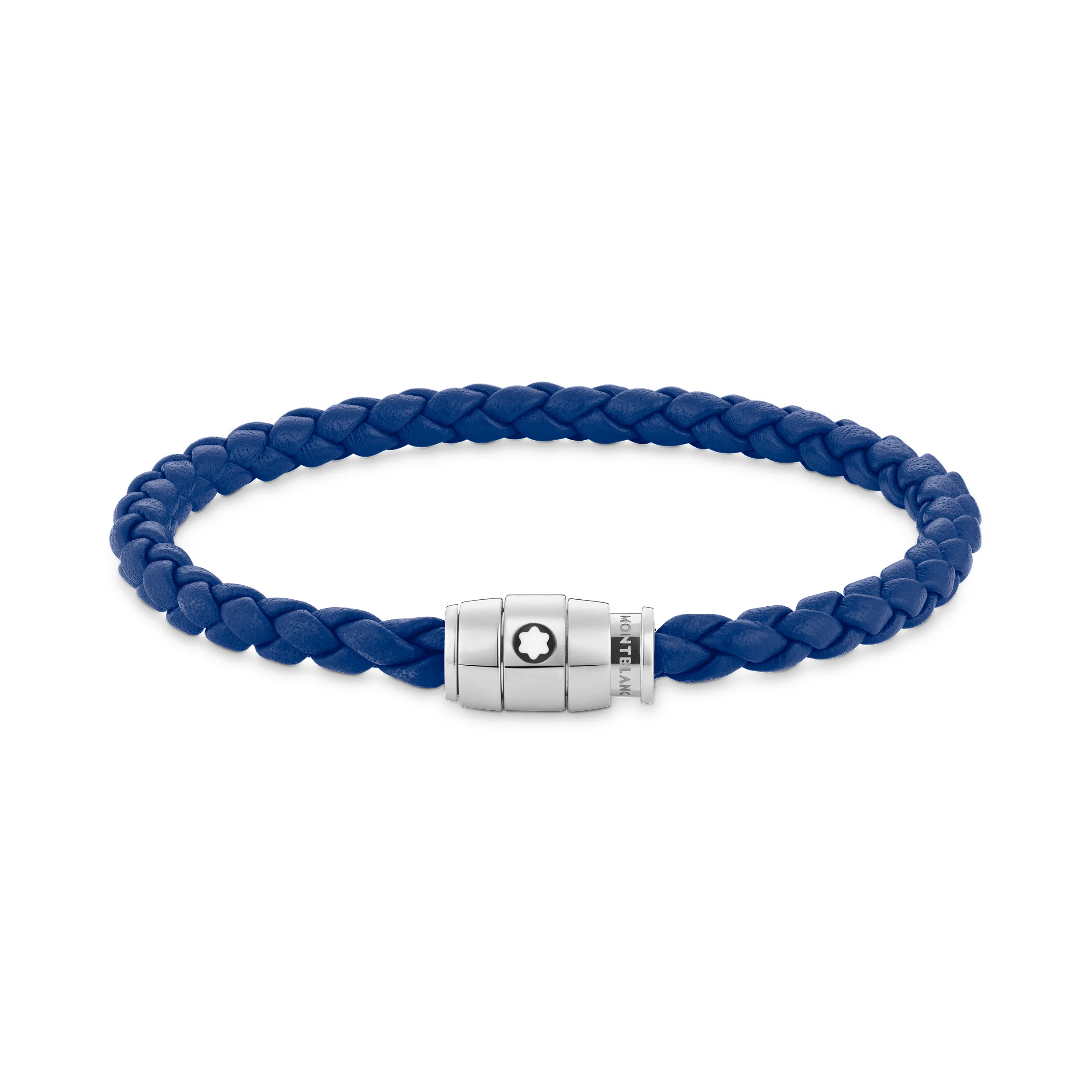 The piece of jewelry, woven from blue leather, has a clasp made of polished stainless steel with one ring in steel with the Montblanc emblem. Ident No. MB130899 Material MATERIAL Cowhide PHYSICAL WEIGHT 12 g