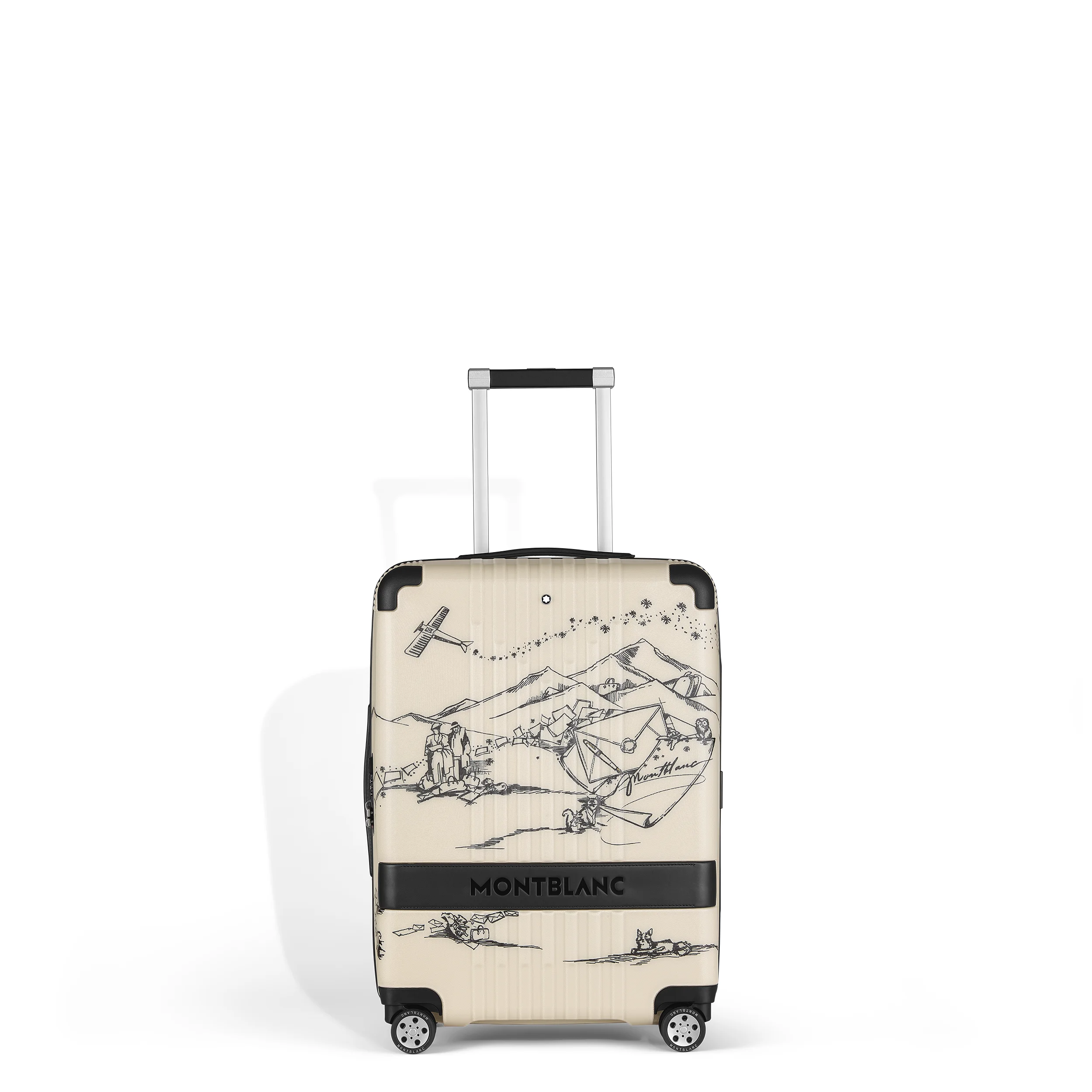 Our Happy Holidays rolling suitcase is an elegant travel companion for the modern traveller. Crafted from high-performance polycarbonate with black leather detailing, this trolley combines durability with sophisticated style. Adorned with a wintery scene at the Mont Blanc, a silk-screen printing technique depicts the travel of writing through swirling papers and envelopes, the Meisterstuck, travelling bags and much more. The interior features two main compartments for organized packing, with elastic bands on one side and a black net on the other. With the dimensions of 38 x 55 x 23 cm, it often meets the cabin luggage criteria. As hand and cabin luggage restrictions can differ from one airline to another, it's recommended to confirm the specific regulations of your airline prior to your journey. Ident No. MB221241 Material Material Polycarbonate Colour Ivory Lining Jacquard lining with hexagonal motif Closing System Zip with TSA lock Dimensions Dimensions 380 mm * 230 mm * 550 mm Physical Weight 3500 g Exportable Legal Notice Emblems are manually centered, one by one, by our artisans. The emblem is centrally positioned, but the manual pressure operation with the machine may shift the emblem itself. This is a characteristic that does not compromise the aesthetic of the product and could not be accepted as complaint according to our policy.