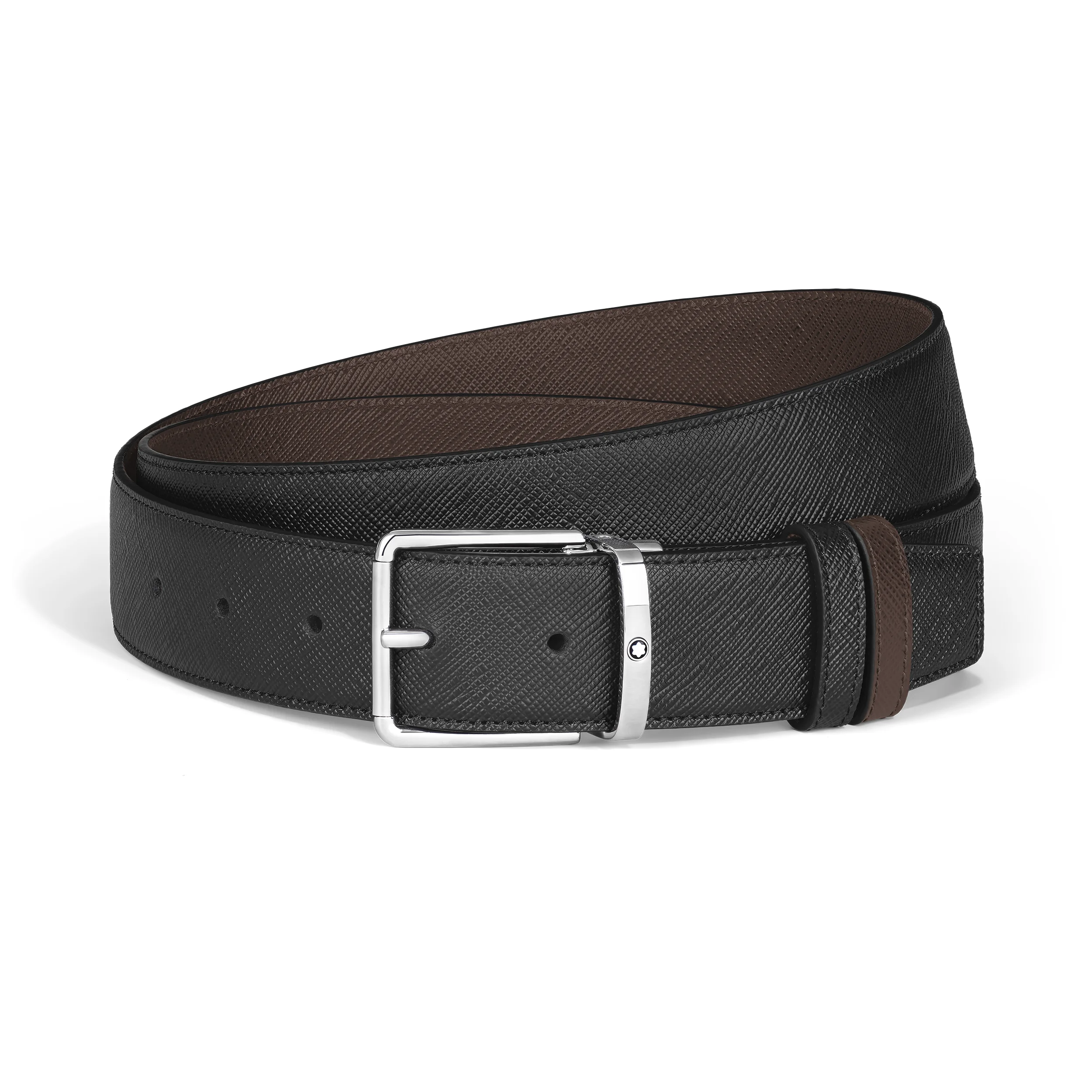 Discover subtle sophistication with this 35mm reversible leather belt, featuring the polished everyday pin buckle in a shiny palladium finish. One side of the belt strap is crafted from black sartorial embossed leather, offering a refined and textured finish, while the reverse showcases the same leather in a rich ebony hue. The sleek minimalist rectangular silhouette of the buckle, complemented by clean edges and a discreet Montblanc logo, makes this belt a versatile accessory. Ident No. MB222361