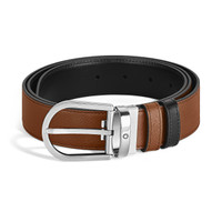 This reversible belt combines elegance and versatility, offering two distinctive styles in one accessory. Featuring our distinctive Montblanc horseshoe buckle in palladium finish, one side of the 35mm strap is presented in a fauve-colored saffiano-printed leather, while the reverse offers sleek black Meisterstuck leather for classic sophistication. Ident No. MB198411 Material Physical Weight 190 g Features Dimensions Dimensions 1200 mm * 35 mm * 5 mm Physical Weight 190 g Exportable Legal Notice Emblems are manually centered, one by one, by our artisans. The emblem is centrally positioned, but the manual pressure operation with the machine may shift the emblem itself. This is a characteristic that does not compromise the aesthetic of the product and could not be accepted as complaint according to our policy.