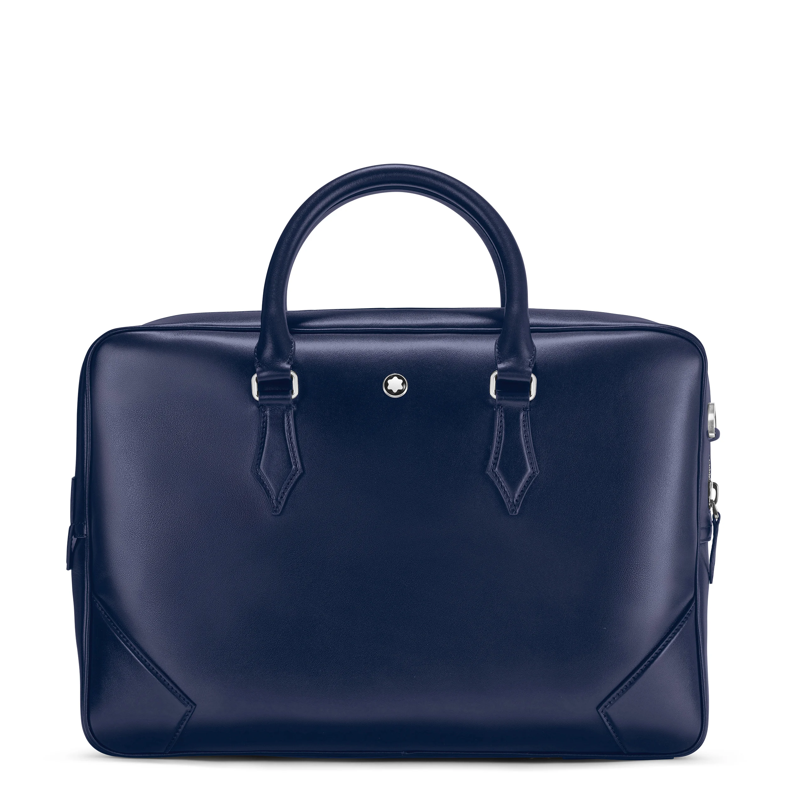 Inspired by the culture of writing, the Meisterstück Document Case is an elegant companion for business trips. Crafted from a new deep shine ink blue leather, all its details speak the language of the nib: stitching, zipper pullers and handles that recall the shape of the nib, perfectly illustrating the essence of Montblanc. A larger version of the logo adorns the bag. The leather top handles, the removable leather shoulder strap and the satellite system offer multiple carrying options, while inside pockets ensure practicality. Ident No. MB131688 Material MATERIAL Calf-skin leather STRAP Adjustable and detachable leather shoulder strap COLOR Ink Blue LINING Coated canvas Dimensions DIMENSIONS 14.76 × 3.15 × 10.63 inches FITTINGS / EMBLEM Emblems are manually centered, one by one, by our artisans. The emblem is centrally positioned, but the manual pressure operation with the machine may shift the emblem itself. This is a characteristic that does not compromise the aesthetic of the product and could not be accepted as complaint according to our policy.