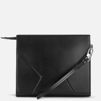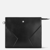 Transport your everyday essentials with style and ease with this versatile Meisterstück pouch. The world of writing influences the design with an envelope silhouette and nib-shaped zip pull, whilst the refined feel is heightened with the use of deep shine leather. Inside the main compartment is an additional open pocket, offering enhanced functionality. Carry by hand, under the arm or looped around the wrist with its detachable wrist handle. Ident No. MB129900 Material MATERIAL Calf-skin leather LEATHER Full-grain calfskin, chrome-tanned, semi-aniline dyed through STRAP Detachable wrist handle COLOR Black LINING Recycled fabric CLOSURE Metal zipper Dimensions DIMENSIONS 9.45 × 1.97 × 7.87 inches FITTINGS / EMBLEM Emblems are manually centered, one by one, by our artisans. The emblem is centrally positioned, but the manual pressure operation with the machine may shift the emblem itself. This is a characteristic that does not compromise the aesthetic of the product and could not be accepted as complaint according to our policy.