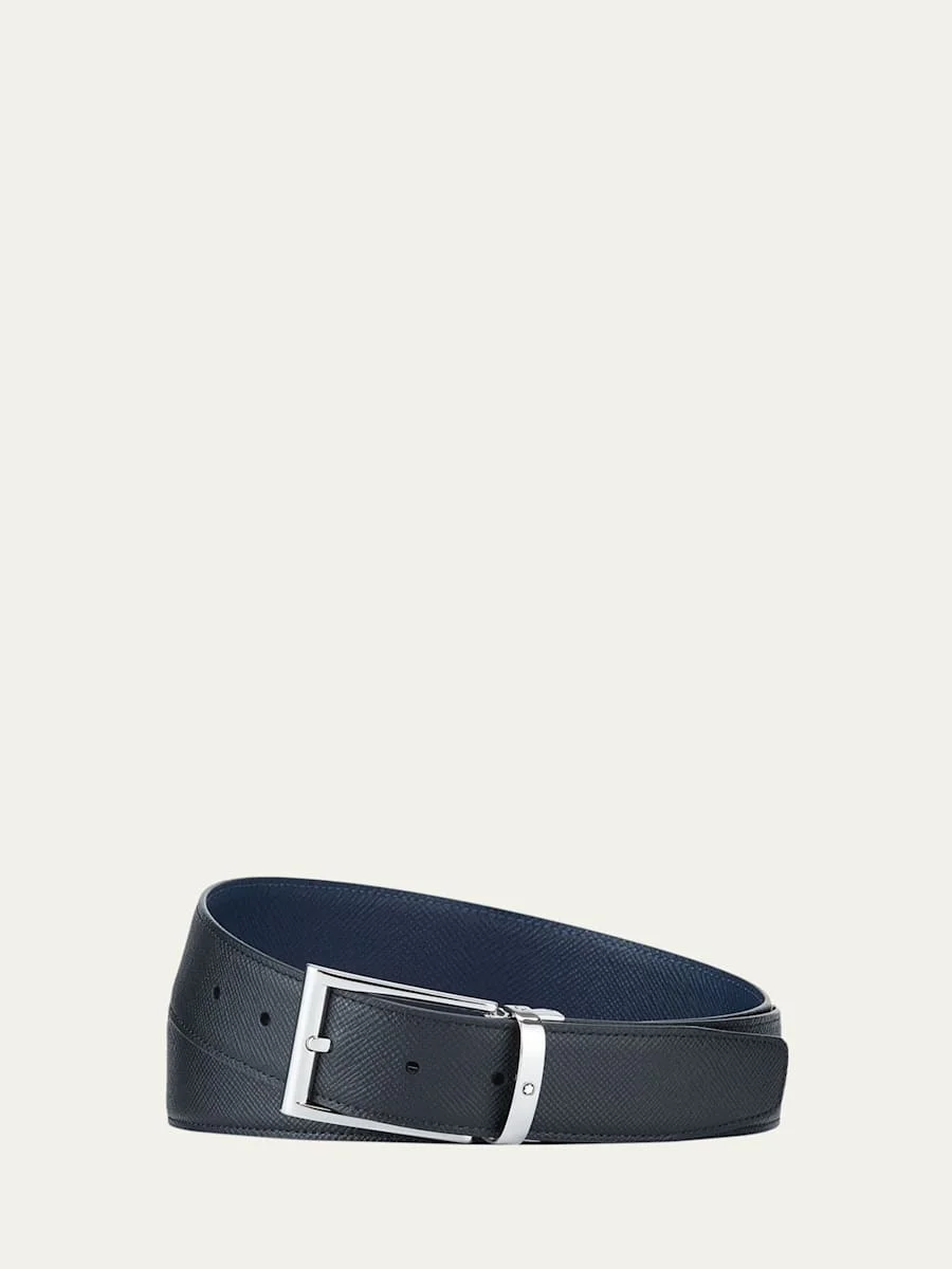 Montblanc black/indigo reversible cut-to-size business belt. Box: 7" x 7" x 2.7". Reversible saffiano printed leather strap. Made in Italy. Online Inquiries: BGS21_N6SHP| Store Inquiries: #3361069
