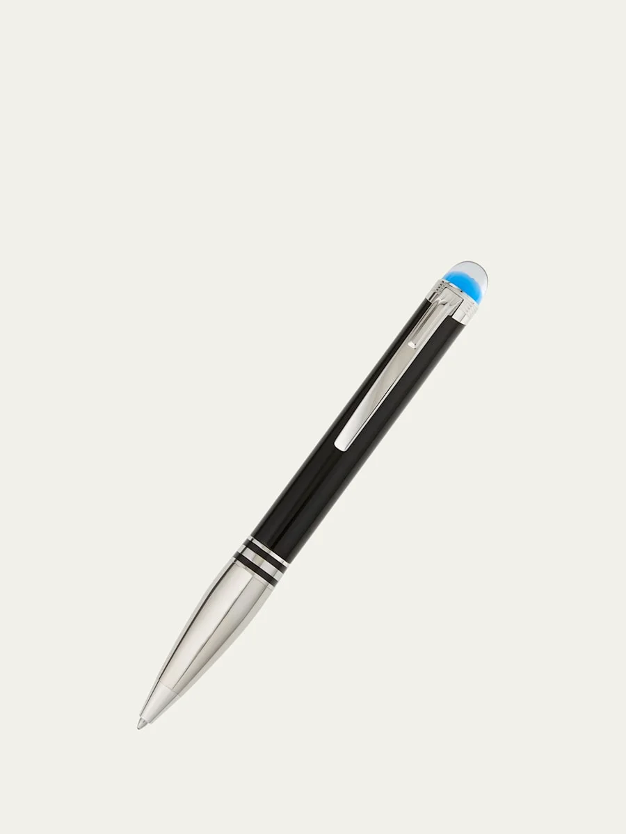 Montblanc ballpoint pen from the StarWalker collection, inspired by the adventures of space exploration. Floating emblem in transparent cap is reminiscent of the Earth emerging above the lunar horizon. Black precious resin barrel. Platinumcoated cap. Weight, 44.12 grams. Made in Germany.