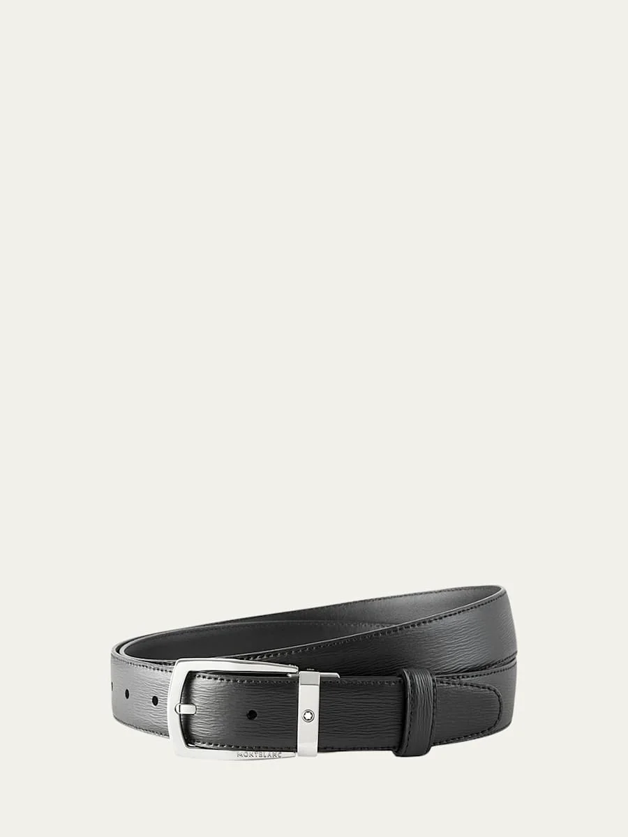 Montblanc "Trapeze" belt in textured cowhide leather. Shiny stainless steel pin buckle with Montblanc emblem. Made in Italy. Online Inquiries: BGS21_NB1UN| Store Inquiries: #3205037