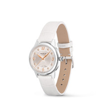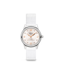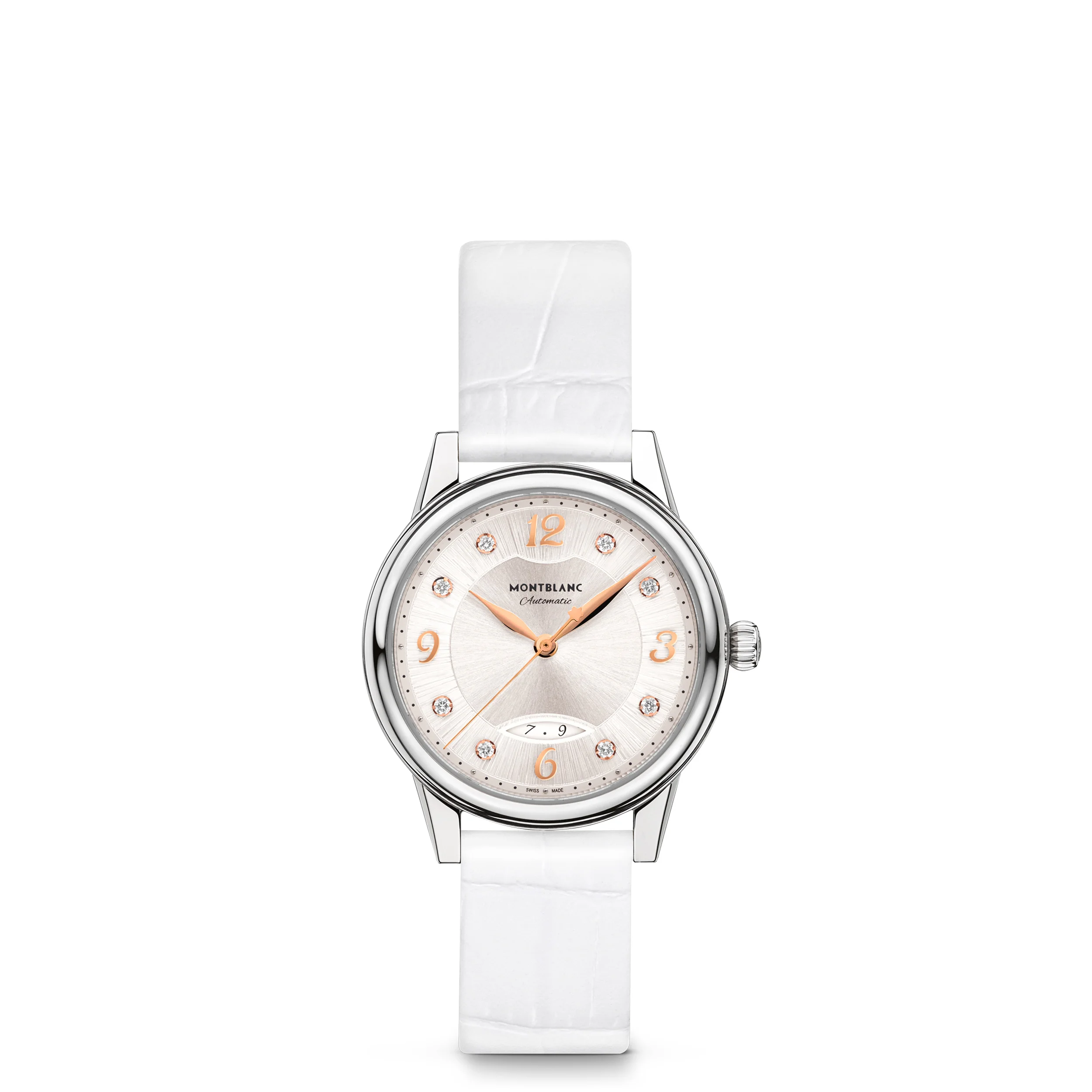 Interpreting the codes of fine watchmaking in an elegant and feminine way, the Montblanc Boheme Automatic Date is inspired by the world of handwriting and comes in a 30 mm stainless steel case. It features an elegant sunbrushed silver-white dial adorned with diamond indexes, rose gold-coated floral Arabic numerals and hands. Other refined details include a filet saute pattern and a stamping technique called file d’etoiles. Fitted with the automatic calibre MB 24.29, this model indicates the hours, minutes and seconds, as well as the date displayed in an almond-shaped aperture with handwritten numerals. The romantic font has also been applied to the dial for the mention “Automatic”. This timepiece is fitted with an interchangeable white calf leather strap with alligator print and an additional strap. Ident No. MB133305