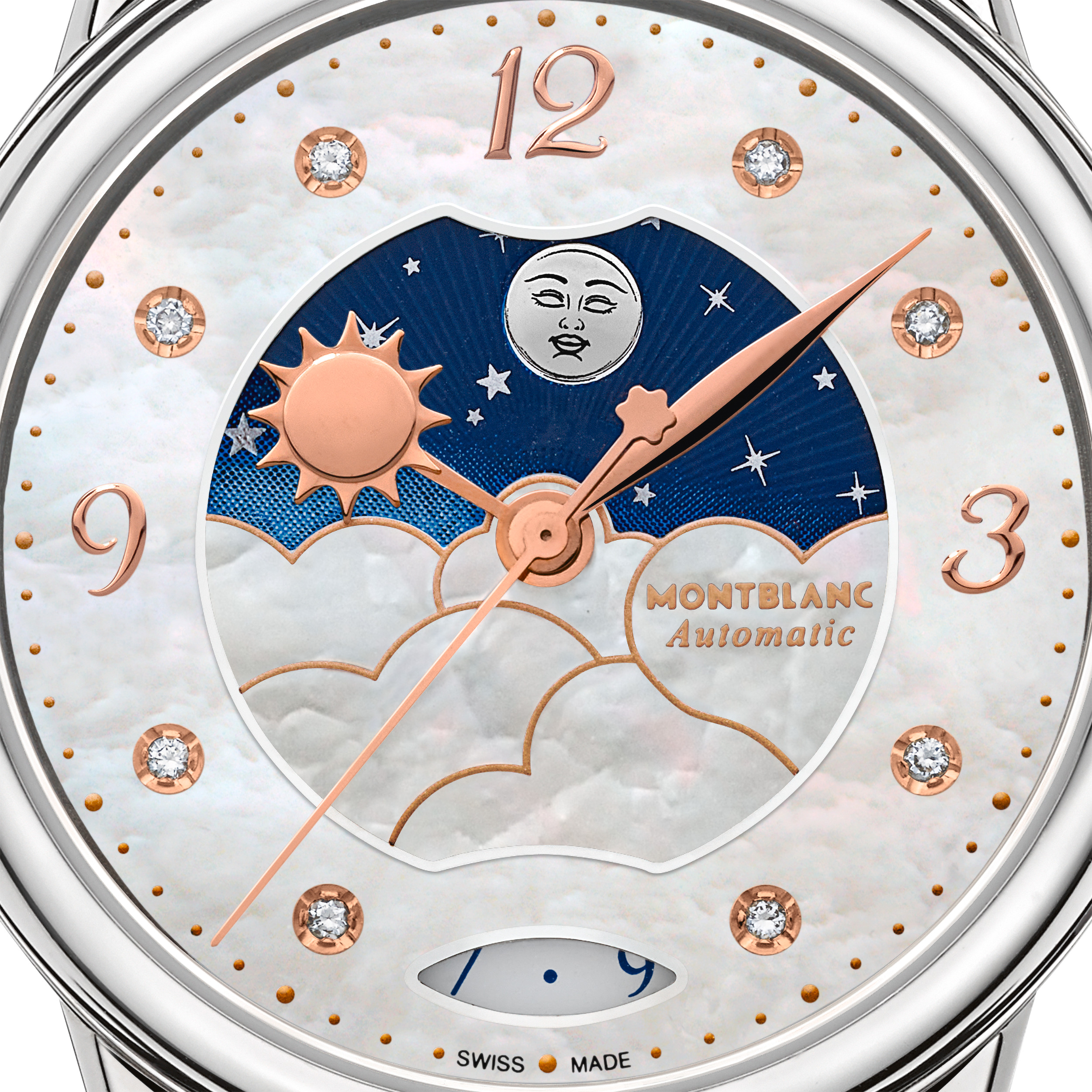 The Montblanc Boheme Day & Night 30mm depicts a fairytale scene with fluffy mother-of-pearl clouds and a day & night disc that shows whether it is daytime or nighttime thanks to different gradients of blue sky enhanced with rays of light. As the sun rises, the moon sets and vice versa. But at midnight, the sun and moon meet. The timepiece is housed in a 30mm stainless steel case and features a dial with rose gold-coated floral indexes, eight diamond indexes, and a blue date in an almond-shaped aperture. The watch is powered by an automatic movement that is visible through a sapphire case back and comes in a stainless steel bracelet version. Ident No. MB129757