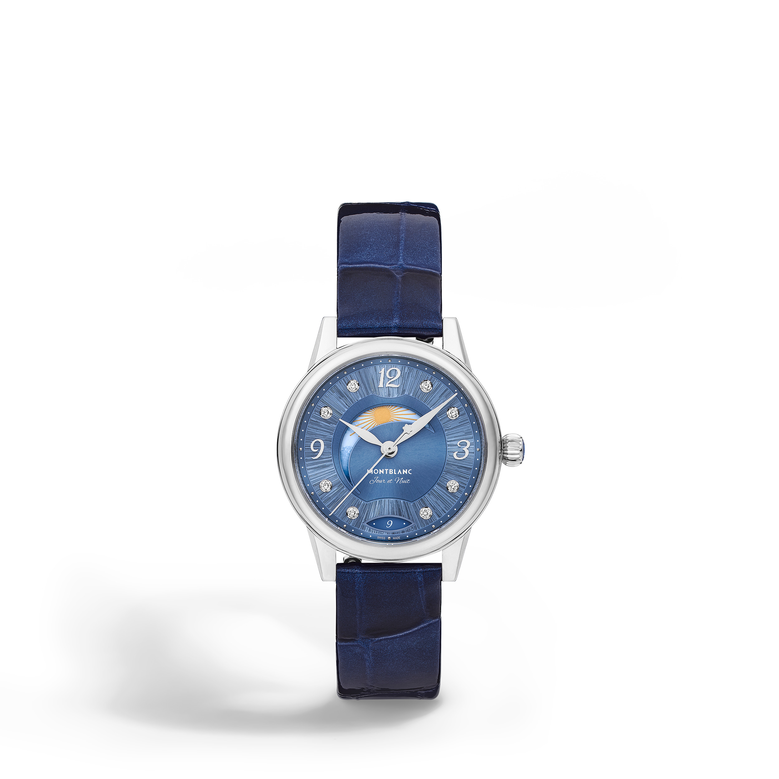 Interpreting the codes of fine watchmaking in an elegant and feminine way, the Montblanc Boheme Day & Night is inspired by the world of handwriting and watercolours and comes in a 34 mm stainless steel case. It features an elegant sunbrushed silver-white dial adorned with diamond indexes, rose gold-coated floral Arabic numerals and hands. Other refined details include a filet saute pattern and a stamping technique called file d’etoiles. Fitted with the automatic calibre MB 24.20, this model indicates the hours, minutes and seconds, as well as the date displayed in an almond-shaped aperture with handwritten numerals. The romantic font has also been applied to the dial for the day & night mention “Jour et Nuit”. The celestial day & night complication shows the changing sky over a period of 24h and brings a romantic and artistic touch to the timepiece as it is created with watercolours. This timepiece is fitted with an interchangeable white calf leather strap with alligator print and an additional strap. Ident No. MB133335VG