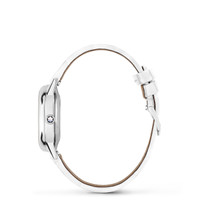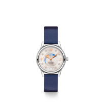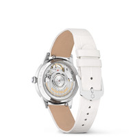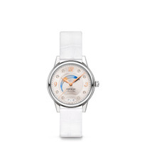 Interpreting the codes of fine watchmaking in an elegant and feminine way, the Montblanc Boheme Day & Night is inspired by the world of handwriting and watercolours and comes in a 30 mm stainless steel case. It features an elegant sunbrushed silver-white dial adorned with diamond indexes, rose gold-coated floral Arabic numerals and hands. Other refined details include a filet saute pattern and a stamping technique called file d’etoiles. Fitted with the automatic calibre MB 24.20, this model indicates the hours, minutes and seconds, as well as the date displayed in an almond-shaped aperture with handwritten numerals. The romantic font has also been applied to the dial for the day & night mention “Jour et Nuit”. The celestial day & night complication shows the changing sky over a period of 24h and brings a romantic and artistic touch to the timepiece as it is created with watercolours. This timepiece is fitted with an interchangeable white calf leather strap with alligator print and an additional strap. Ident No. MB133333