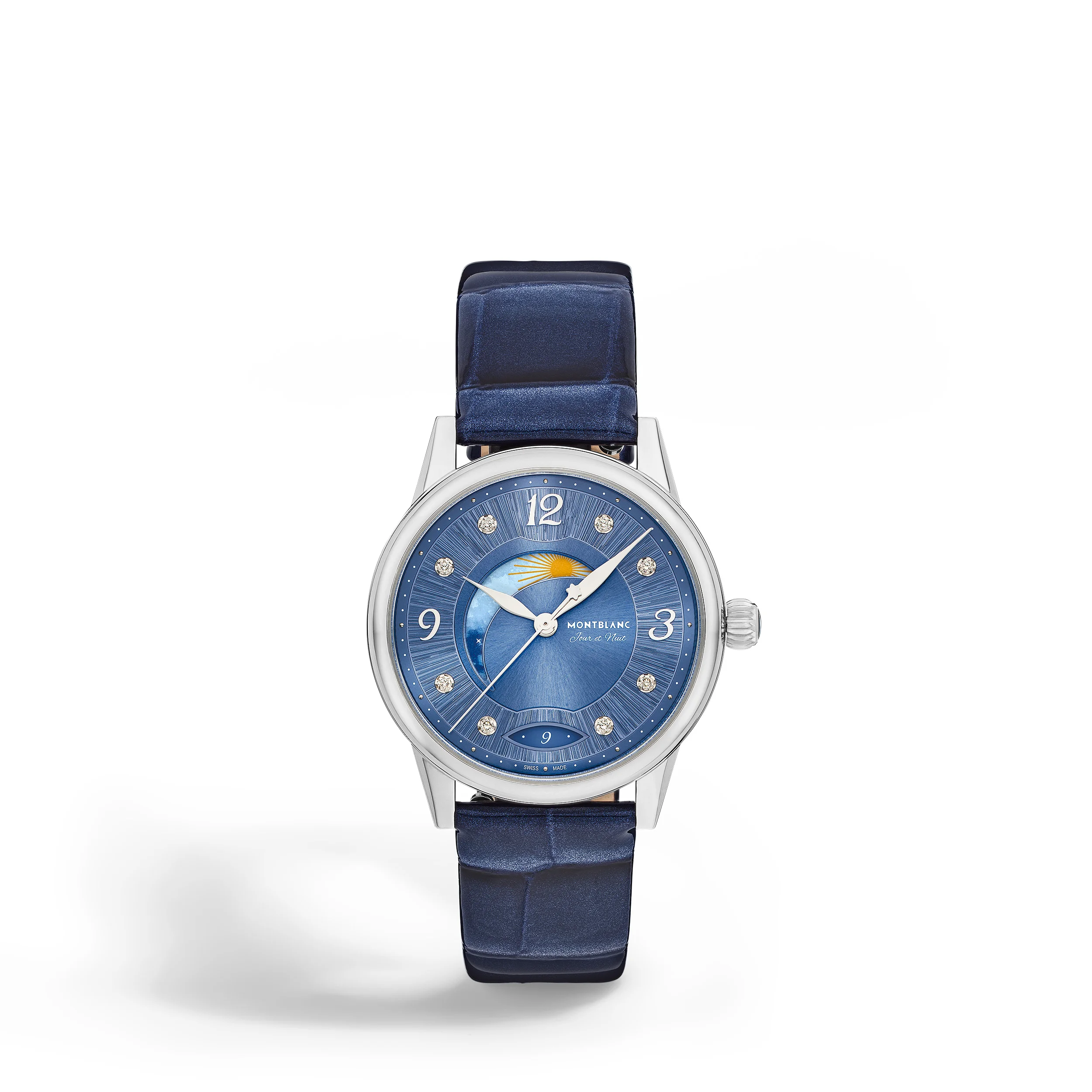 Interpreting the codes of fine watchmaking in an elegant and feminine way, the Montblanc Boheme Day & Night is inspired by the world of handwriting and watercolors and comes in a 34 mm stainless steel case. It features an elegant sunbrushed blue dial adorned with diamond indexes, rhodium-coated floral Arabic numerals and hands. Other refined details include a filet saute pattern and a stamping technique called file d’etoiles. Fitted with the automatic calibre MB 24.20, this model indicates the hours, minutes and seconds, as well as the date displayed in an almond-shaped aperture with handwritten numerals. The romantic font has also been applied to the dial for the day & night mention “Jour et Nuit”. The celestial day & night complication shows the changing sky over a period of 24h and brings a romantic and artistic touch to the timepiece as it is created with watercolors. This timepiece is fitted with an interchangeable blue calf leather strap with alligator print and an additional strap. Ident No. MB133310