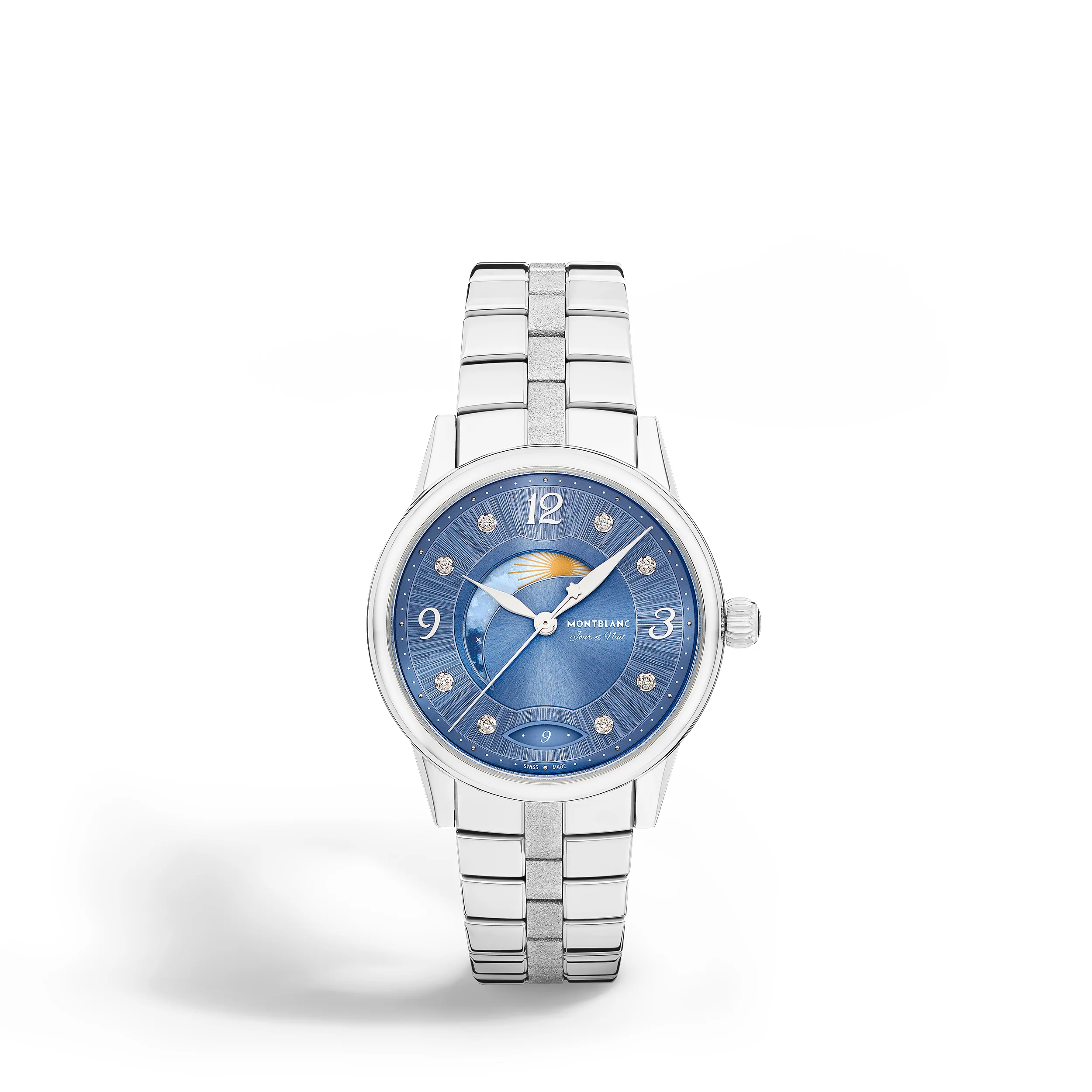Interpreting the codes of fine watchmaking in an elegant and feminine way, the Montblanc Boheme Day & Night is inspired by the world of handwriting and watercolors and comes in a 34 mm stainless steel case. It features an elegant sunbrushed blue dial adorned with diamond indexes, rhodium-coated floral Arabic numerals and hands. Other refined details include a filet saute pattern and a stamping technique called file d’etoiles. Fitted with the automatic calibre MB 24.20, this model indicates the hours, minutes and seconds, as well as the date displayed in an almond-shaped aperture with handwritten numerals. The romantic font has also been applied to the dial for the day & night mention “Jour et Nuit”. The celestial day & night complication shows the changing sky over a period of 24h and brings a romantic and artistic touch to the timepiece as it is created with watercolors. This timepiece is fitted with an interchangeable stainless steel bracelet with a textured central link and fine adjustment system. Ident No. MB134343