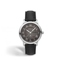The Montblanc Star Legacy Automatic Day & Date takes the Maison's finest design codes to a new level of elegance. The timepiece presents a sfumato anthracite dial with exploding star guilloche motif, a filet saute, rhodium-coated Roman numerals, leaf-shaped hands and indicates the hours, minutes, seconds, day in a choice of French or English and date in a simple elegant way. This model is powered by the MB 24.28 automatic movement and is housed in a 39 mm stainless steel, pebble-shaped case fitted with an open case back offering a view on the oscillating weight decorated with the Montblanc emblem. The anthracite interchangeable calf leather strap has been specially designed by Montblanc's Artistic Director Marco Tomasetta who found inspiration in the Maison's writing instrument nibs for its pointed shape, enhanced with a vertical sfumato effect. Ident No. MB134296