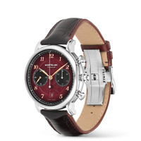 The Montblanc Star Legacy Chronograph Limited Edition of 1786 pieces pays tribute to the intrepid Jacques Balmat who was the first to reach the summit of the Mont Blanc in 1786. The timepiece presents a burgundy tone glacier patterned dial with a sfumato effect around the outside, a rack minuterie and rose gold-coated numerals. The indications include a central chronograph seconds hand with Montblanc emblem on the counterweight and a 30-minute chronograph counter with rhodium-coated hands, while the timekeeping functions – hours, minutes, and small seconds – feature rose-gold-coated hands. This model is powered by the MB 24.31 automatic movement and is housed in a 42 mm stainless steel case with an open case back on the movement. The timepiece comes with an interchangeable calf leather strap with an alligator print and vertical sfumato. Ident No. MB133245 Movement MOVEMENT TYPE Automatic movement Chronograph POWER RESERVE 48 h FREQUENCY (VPH) 4 /h FREQUENCE (HZ) 28800,0 Hz Case CASE DIAMETER 1.65 inches CASE HEIGHT 0.56 inches WATER RESISTANT 5 bar (50 m) bar BEZEL Fixed SAPPHIRE CRYSTAL Sapphire crystal case back