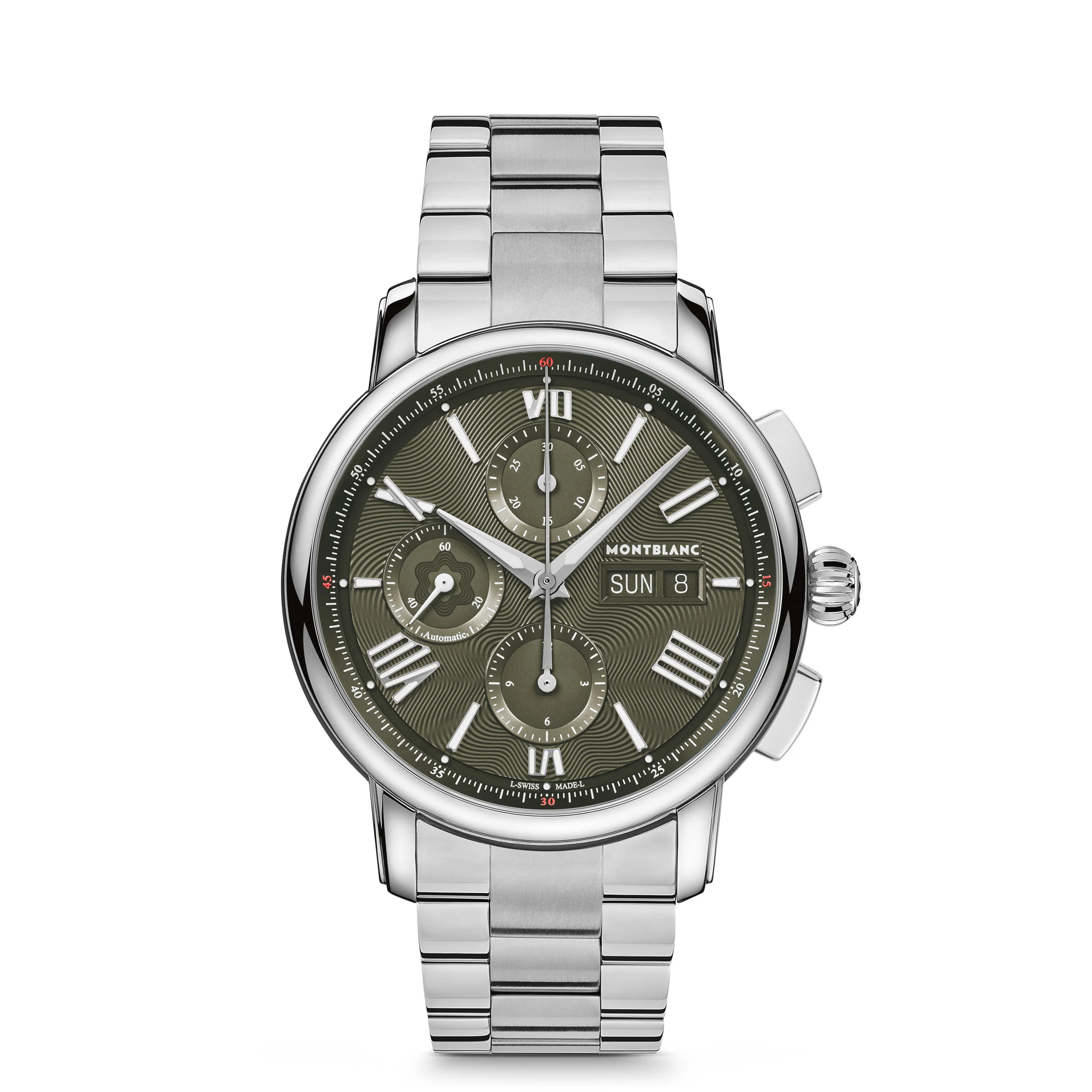 The Montblanc Star Legacy Chronograph Day & Date Limited Edition of 800 pieces takes its inspiration from Minerva pocket watches from the late 19th and early 20th century with their round, polished, pebble-shaped cases and onion-shaped crowns. Its beautiful green dial features Montblanc’s signature exploding star pattern along with rhodium-coated sword-shaped hands and numerals. It is powered by the automatic movement MB 25.07 that includes a chronograph, the day of the week, and the date. This timepiece is also fitted with an interchangeable stainless steel bracelet. Ident No. MB132951 Movement MOVEMENT TYPE Automatic movement Chronograph POWER RESERVE 48 h FREQUENCY (VPH) 4 /h FREQUENCE (HZ) 28800,0 Hz NUMBER OF JEWELS 25 Jewels Case CASE DIAMETER 1.69 inches CASE HEIGHT 0.58 inches WATER RESISTANT 5 bar (50 m) bar BEZEL MATERIAL Stainless Steel SAPPHIRE CRYSTAL Sapphire crystal case back