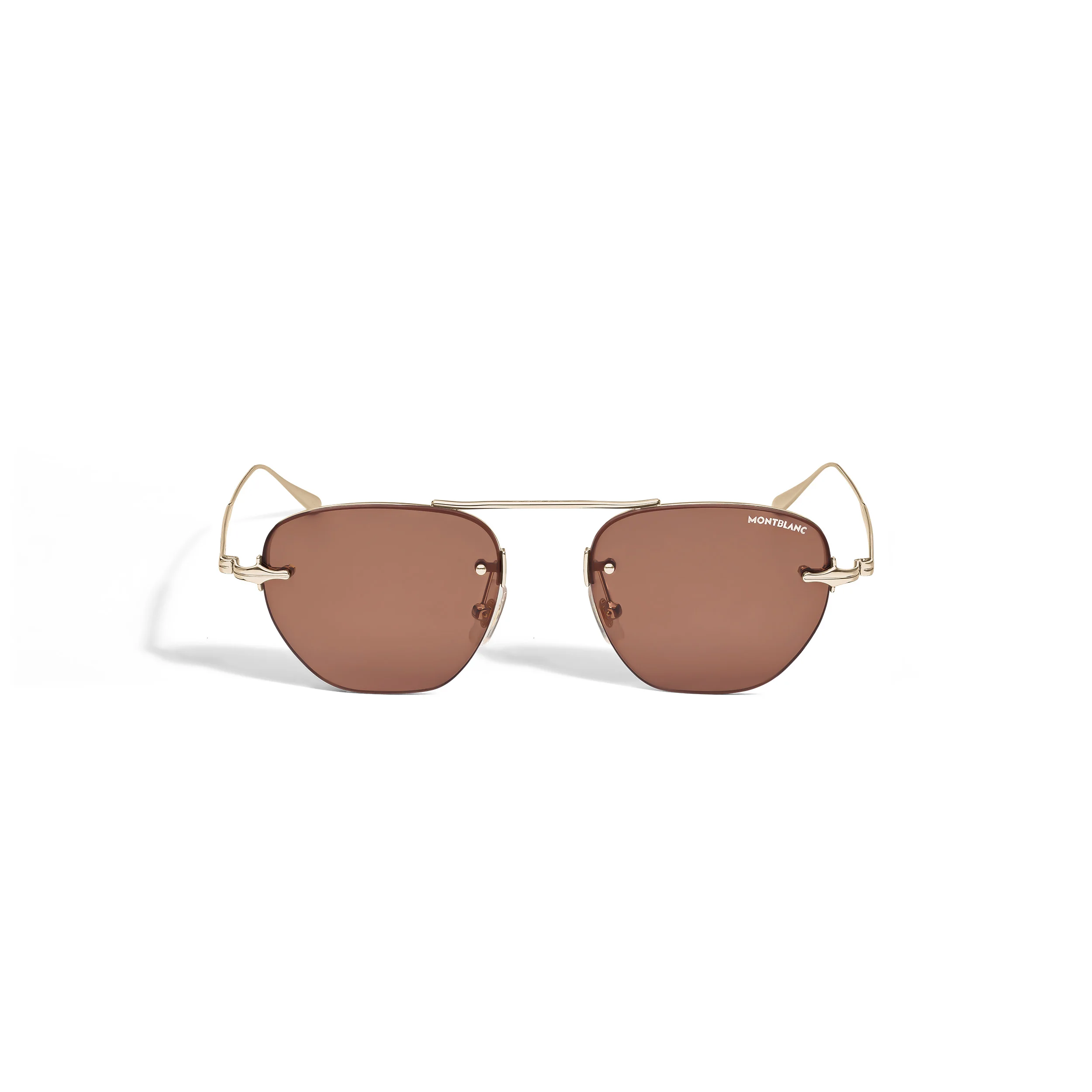 These sunglasses in a round style have a gold-coloured metal frame and brown lenses. Inspired by the nib design of the writing instruments, a decorative nib detail is featured on the metal temple design. The Montblanc one line logo is engraved on the right side of the temple, additionally the logo is lasered on the left lens and a decorative detail is engraved on the end tips of the temple. Ident No. MB135570