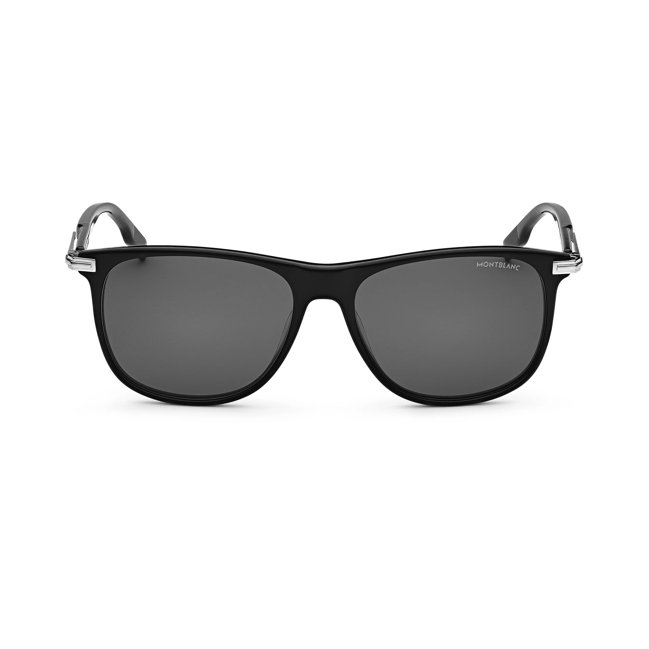These sunglasses in a rectangular style have a black-colored acetate frame and gray-colored lenses. The clip detail is the core element of the temple design, it is both aesthetical and functional as it allows you to hang the frames on pockets. The snowcap Montblanc Emblem is encapsulated in the temple clip detail and the Montblanc logo is lasered onto the left lens. Ident No. MB129804