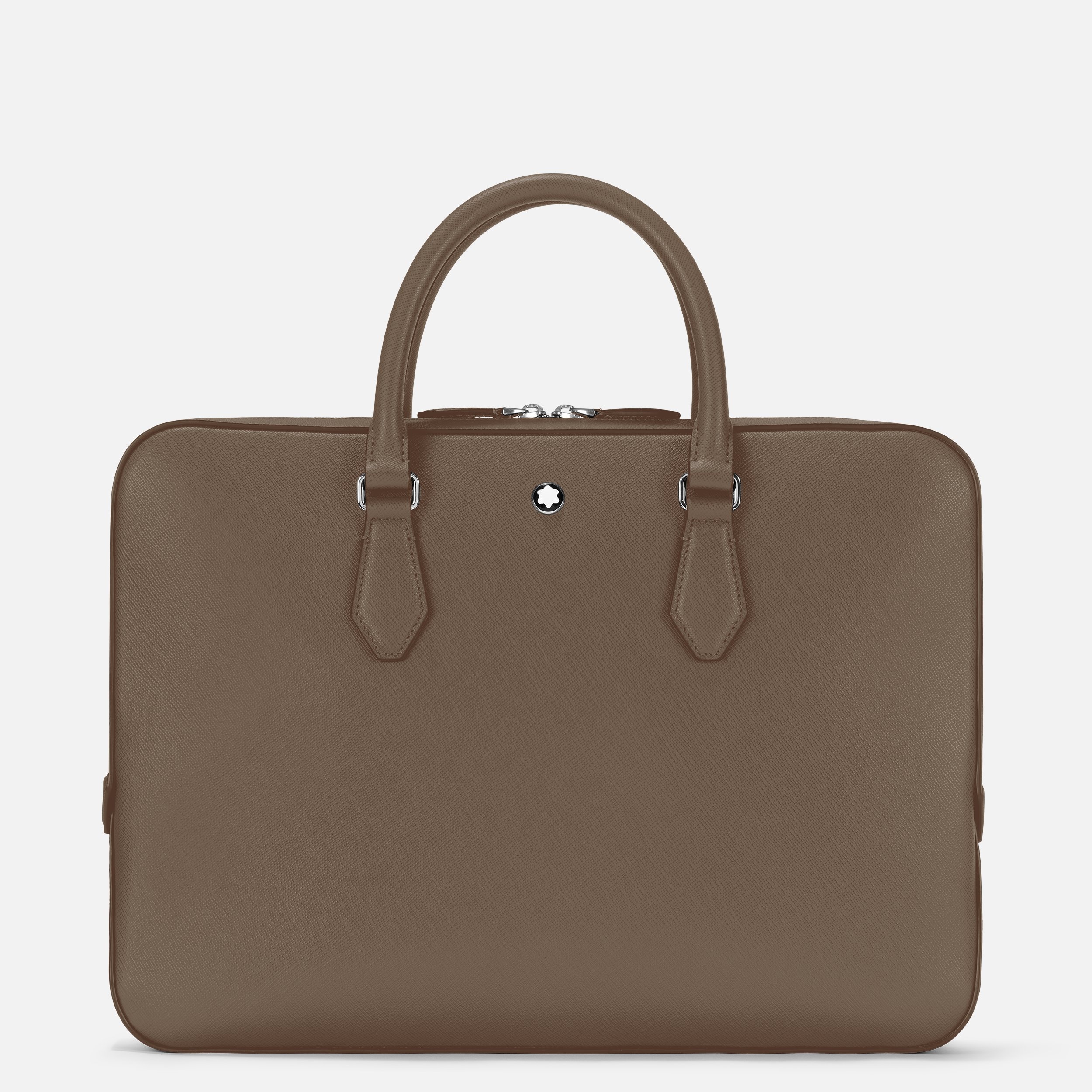 Introducing the Sartorial thin document case, a sleek and sophisticated companion for the modern professional. Crafted with luxurious saffiano-printed leather, this case effortlessly combines style and functionality. It features a padded main compartment designed to protect laptops up to 13 in size during transportation. The interior includes a black fabric lining, a zipped pocket, two open pockets, and two dedicated pockets for writing instruments, providing ample organization options for your essentials. The standout feature is the satellite system, allowing easy attachment to a trolley for convenient travel. Ident No. MB198109 Material MATERIAL Soft Leather STRAP Adjustable and detachable leather shoulder strap COLOR Mastic LINING Cotton and polyamide lining Dimensions DIMENSIONS 15.75 × 1.97 × 11.42 inches