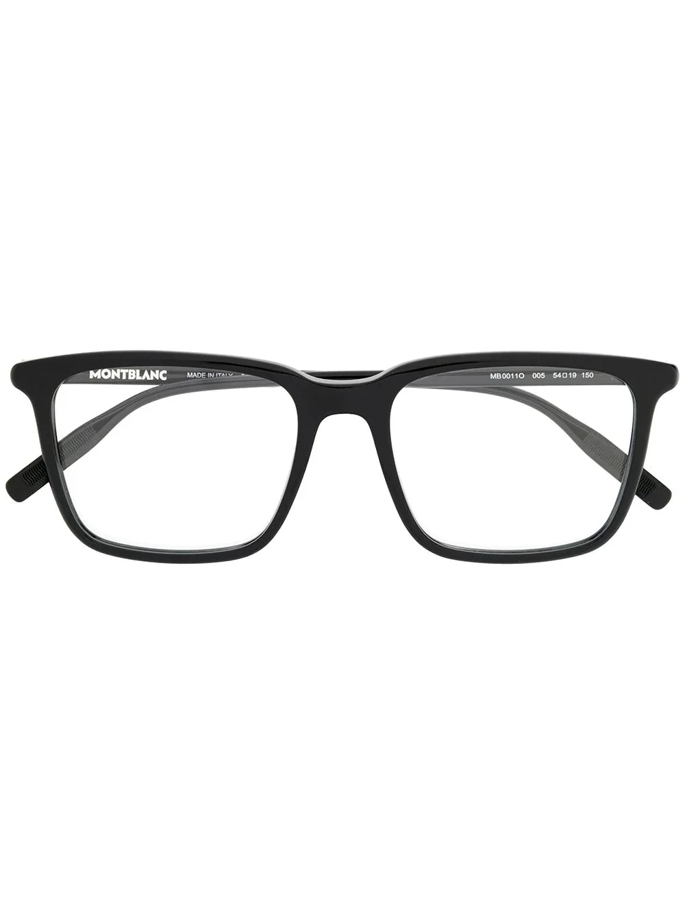 rectangular frame glasses Black rectangular frame glasses from Montblanc featuring a brand logo on internal arm and small brand logo on exterior arm. This item is unisex. Made in Italy Composition Acetate 100% SIZE & FIT Measurement Bridge Width 0.74 in(1.9 cm) Lens Diameter 2.12 in(5.4 cm) Total Width 5.7 in(14.5 cm) Arm Length 5.9 in(15 cm)