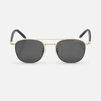 These light weight sunglasses in a squared style have a gold colored metal frame and gray lenses. They feature a double metal bridge on the front. The tubular temple inspired by the Meisterstück writing instruments is enriched with a 3 rings detail. The Montblanc logo is lasered on the left lens and the snowcap logo is encapsulated on the temple. The anti-slip pattern is lasered onto the internal side of the temple tips to increase comfort. Ident No. MB131309