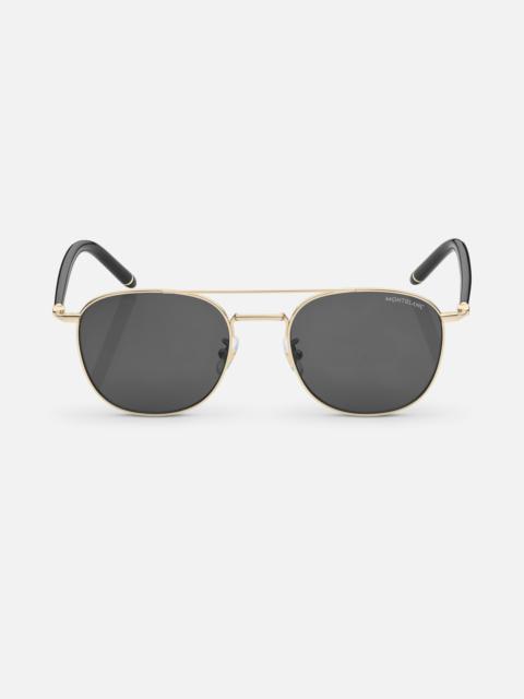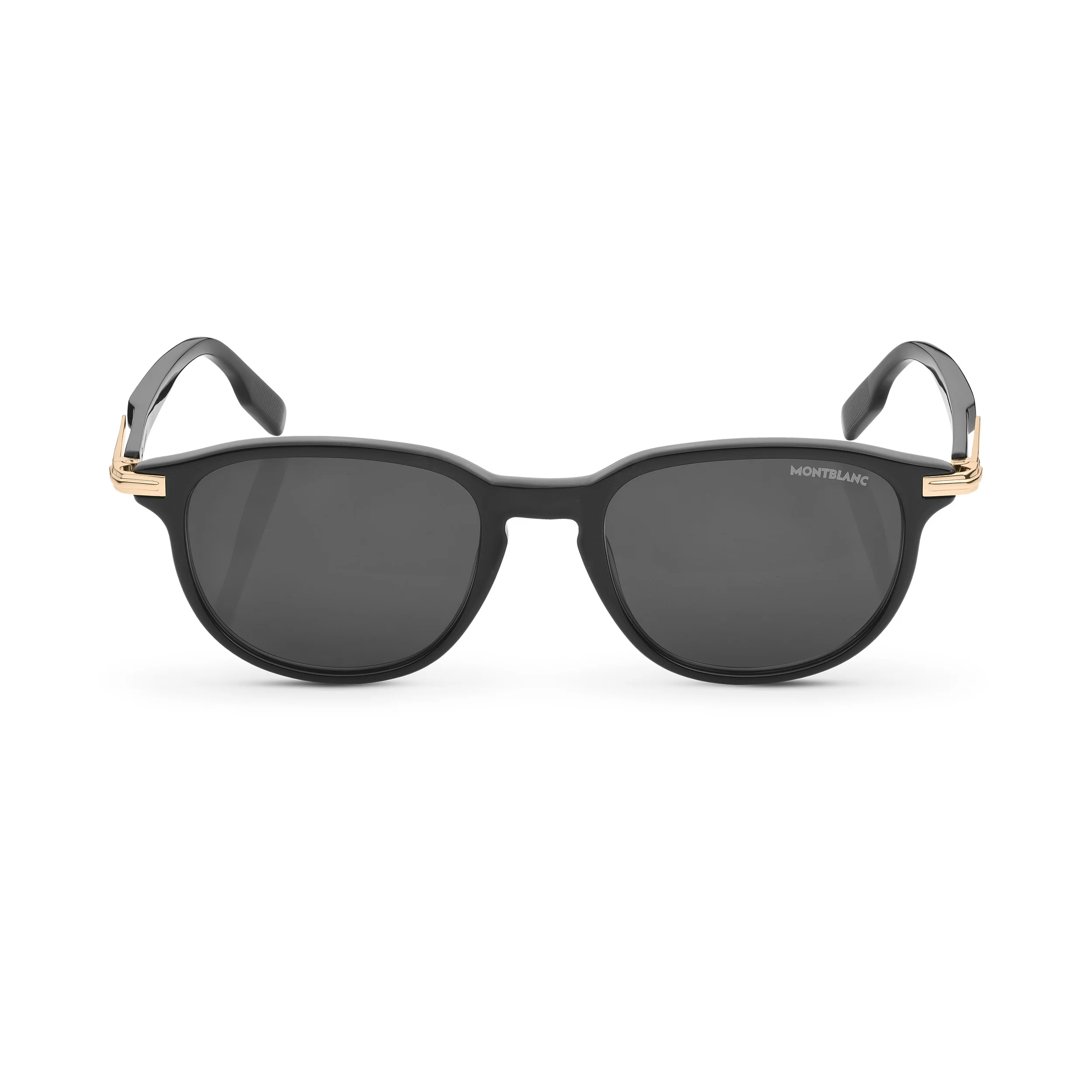These squared sunglasses have a black colored acetate frame and black colored lenses. The gold colored clip detail is the core element of the temple design. It celebrates an important element of the Meisterstuck writing instrument, which also enables the frame to hang on pockets. The snowcap Montblanc Emblem is encapsulated in the temple clip detail and the Montblanc logo is lasered on the left lens Ident No. MB131311