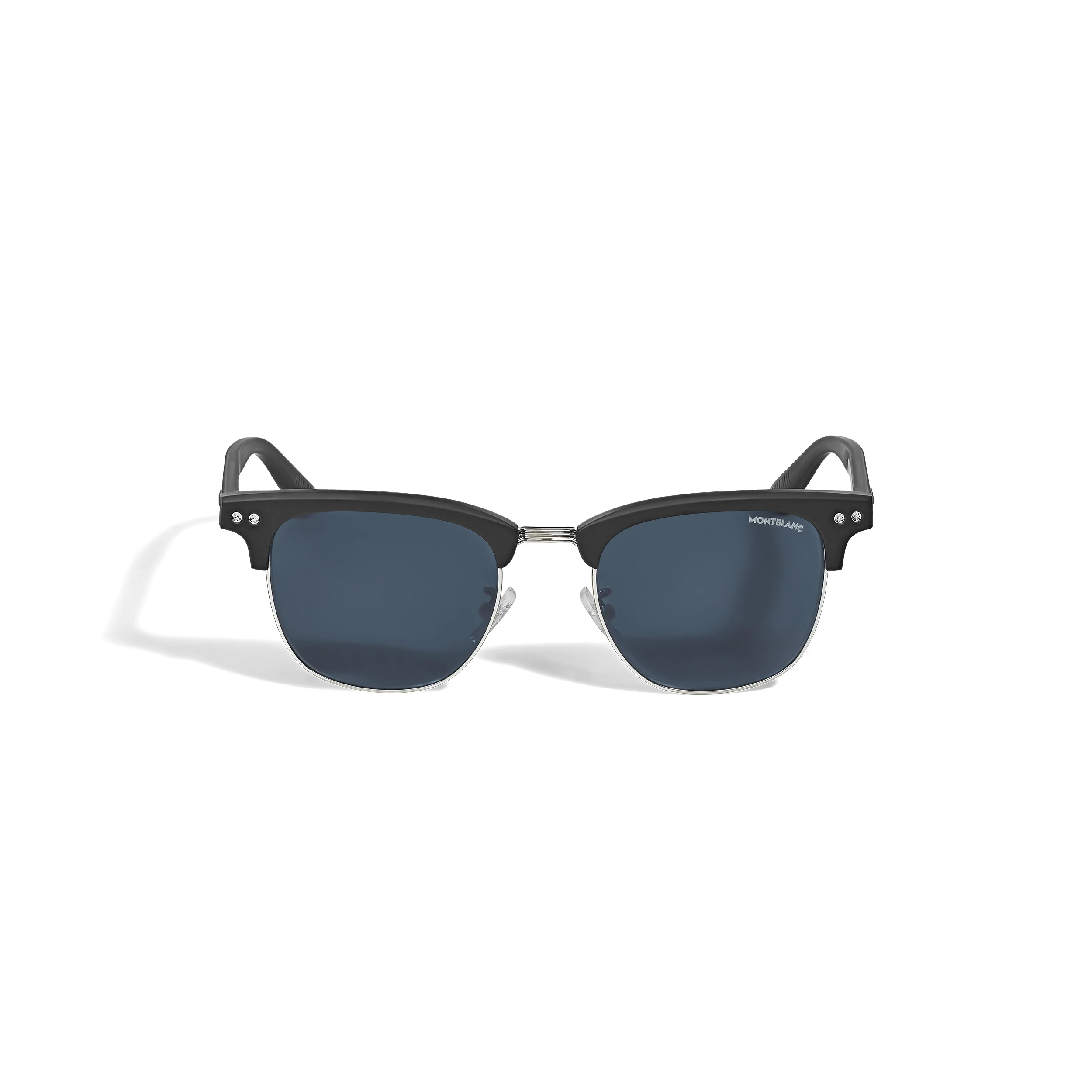 These sunglasses in a squared style have a black-coloured acetate and metal frame and blue lenses.The rivets on the front feature a snowcap detail and the Montblanc Extreme 3.0 pattern incorporated in the inside of the temple design. The Montblanc Emblem is encapsulated in the temple design. The Montblanc logo is lasered on the left lens and the anti-slip pattern is lasered onto the internal side of the temple tips to increase comfort. Ident No. MB135573