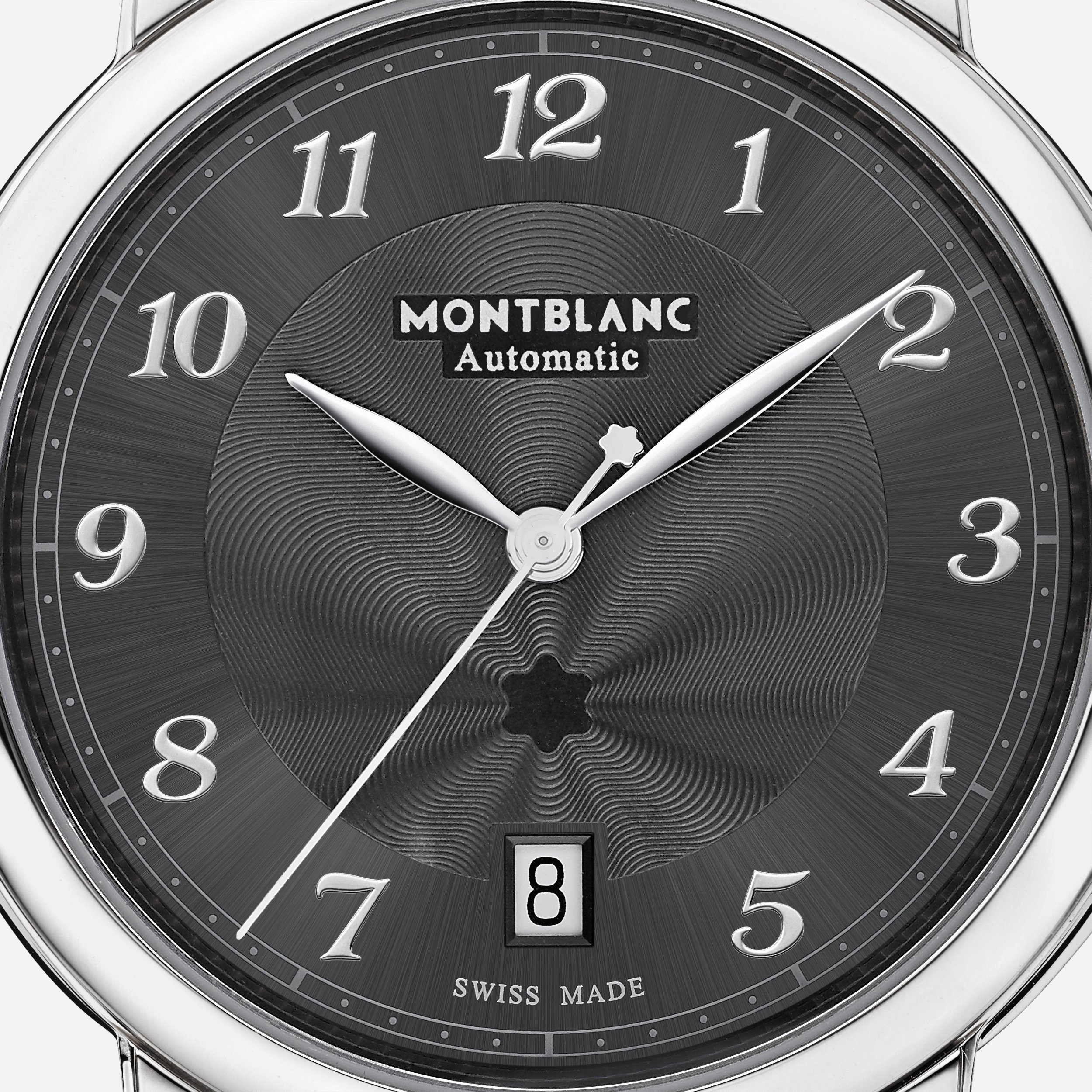 The Star Legacy Automatic Date radiates pure elegance and exhibits all the attributes of classical watchmaking. It features all the codes of the collection, including Arabic breguet numerals, leaf-shaped, rhodium-coated hands and the distinct curved line of the case. The dial stands out with its exploding star guilloché pattern and the unique railway minute track with dots instead of the traditional lines. A further mark of distinction is the exquisite gray Sfumato alligator leather strap from the Montblanc Pelletteria. The Star Legacy Automatic Date comes with a 39 mm case made from stainless steel and sapphire glass with an anti-reflection coating. Ident No. MB118517 Movement MOVEMENT TYPE Automatic, self-winding MOVEMENT CALIBER MB 24.01 POWER 42,0 h FREQUENCE 28800,0 /h FREQUENCY 4 Hz NUMBER OF JEWELS 21,0 Jewels FLAT HAIRSPRING NUMBER OF COMPONENTS 78 Complications COMPLICATIONS Date by disc Case CASE MATERIAL Stainless Steel DIAL Slate gray-colored dial with rhodium-coated Arabic numerals BEZEL Fixed ANTI-SCRATCH CRYSTAL Yes CRYSTAL SHAPE Domed CRYSTAL DESCRIPTION Sapphire crystal case back CRYSTAL TYPE Sapphire CROWN Stainless steel with Montblanc emblem DISTANCE BETWEEN HORNS 0.75 inches WATER RESISTANT 3 bar (30 m) bar CASE BACK MATERIAL Stainless steel case CASE DIAMETER 1.54 inches BEZEL MATERIAL Stainless Steel BEZEL DESCRIPTION Fixed, stainless steel