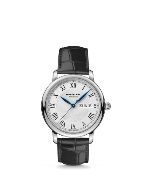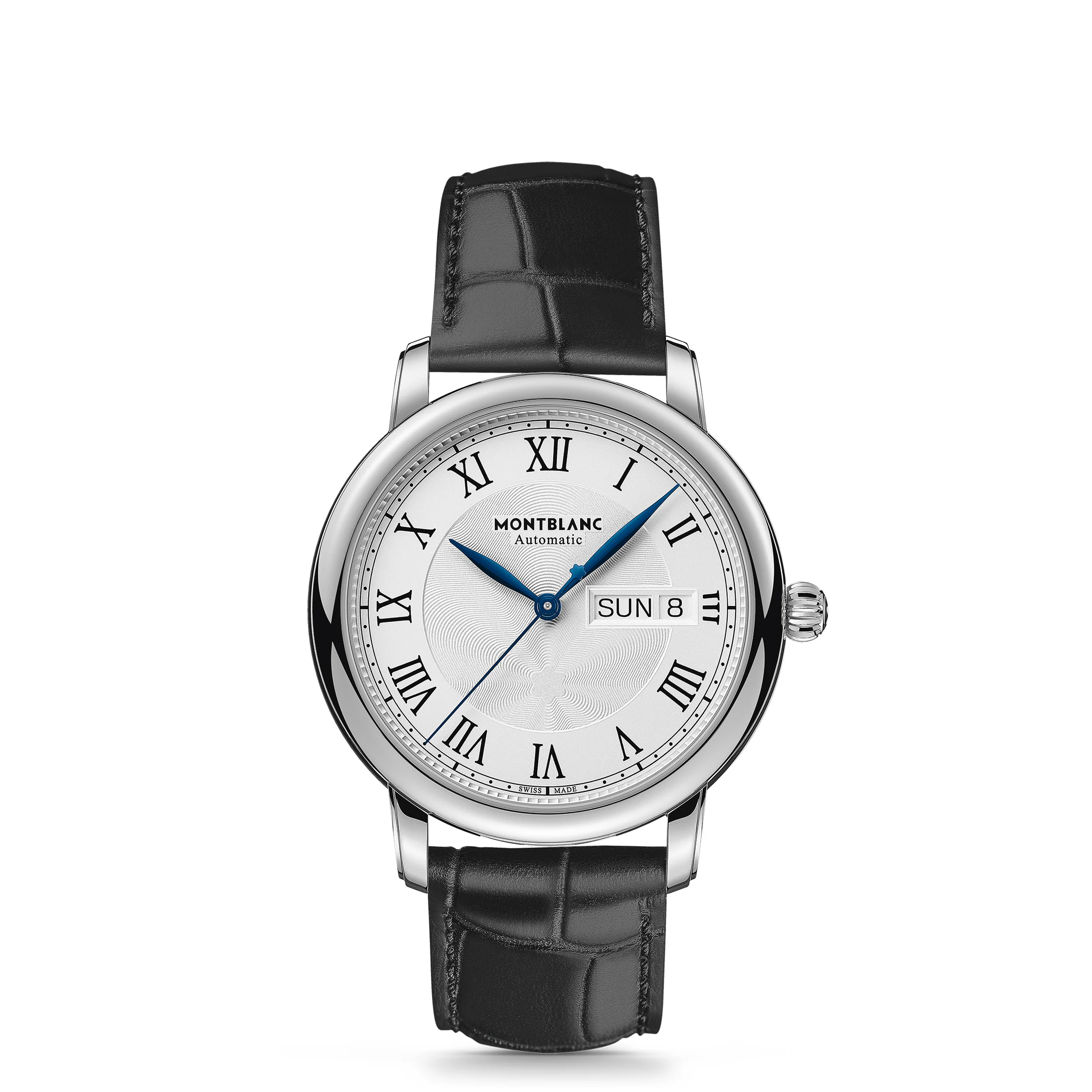 The Montblanc Star Legacy Collection takes its inspiration from Minerva’s heritage and the company’s pocket watches that were made during the late 19th and early 20th centuries. In line with the design codes of the product line, the Montblanc Star Legacy Automatic Day & Date features a refined silver-white dial with the Montblanc exploding star guilloché pattern, Arabic numerals, leaf-shaped hands, a “filet sauté” guilloché motif and a railway track. The timepiece is equipped with the automatic caliber MB 24.28 and features the hours, minutes and seconds in the center and the day & date in an aperture at three o'clock. It comes in a 39 mm stainless steel case and is fitted with a black calf leather strap with alligator print. Ident No. MB128686 Movement MOVEMENT TYPE Automatic, self-winding NUMBER OF JEWELS 26 Jewels Complications COMPLICATIONS Day and date by disc Case CASE MATERIAL Stainless Steel DIAL Silvery-white colored dial with black Roman numerals BEZEL Fixed ANTI-SCRATCH CRYSTAL Yes CRYSTAL SHAPE Domed CRYSTAL DESCRIPTION Sapphire crystal case back CRYSTAL TYPE Sapphire CROWN Stainless steel with Montblanc emblem DISTANCE BETWEEN HORNS 0.75 inches WATER RESISTANT 5 bar (50 m) bar CASE BACK MATERIAL Stainless steel case BRACELET COLOR Black CASE DIAMETER 1.54 inches BEZEL MATERIAL Stainless Steel