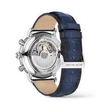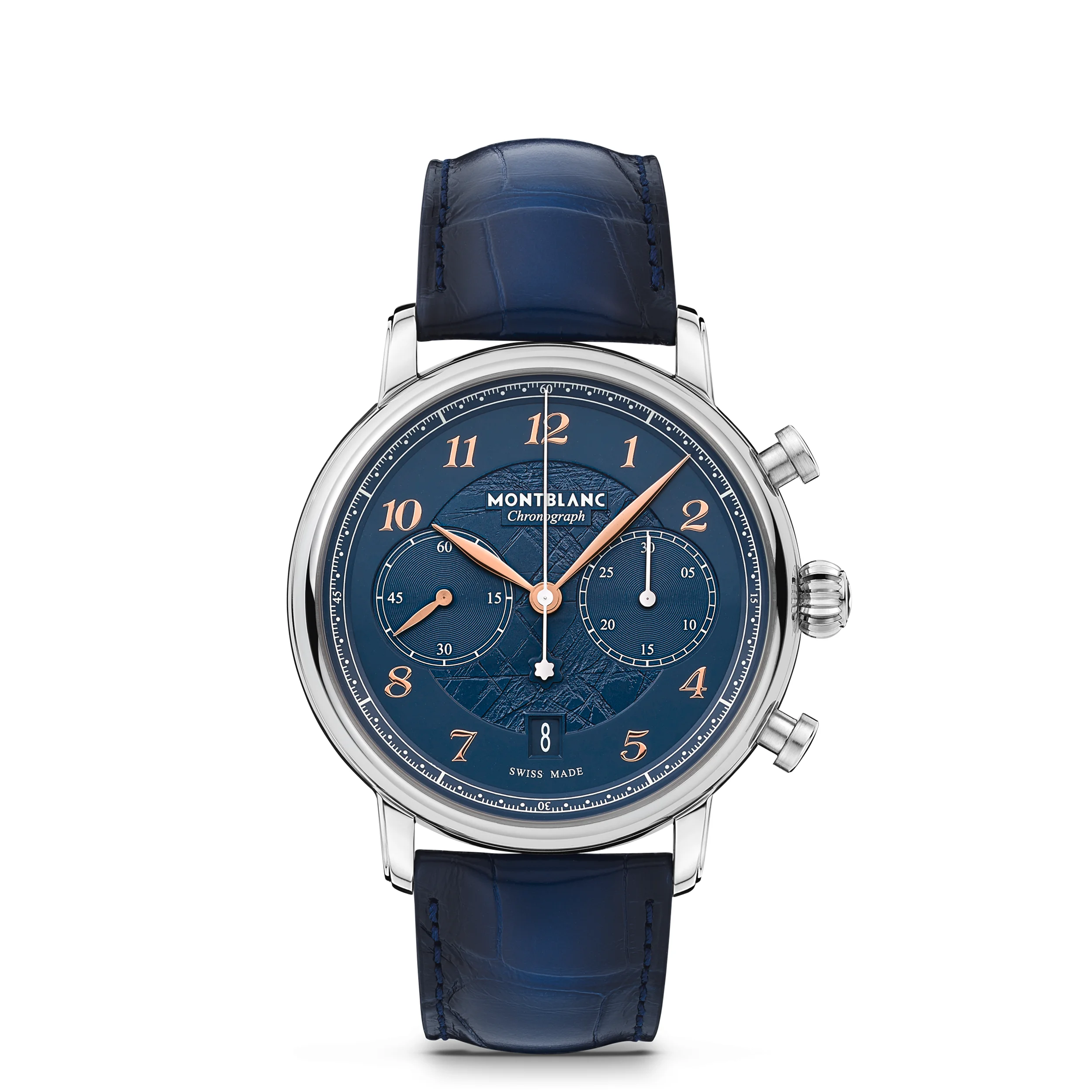 The Montblanc Star Legacy Chronograph is limited to 1786 pieces and comes in a 42mm pebble-shaped stainless steel case with rose gold-coated Arabic numerals and an eye-catching blue glacier pattern dial. The dial is decorated with a layered ice design that was inspired by the Mer de Glace, the main glacier of the Mont-Blanc Mountain. The center of the dial is created using a special stamp that reproduces this glacier texture and celebrates the "blue hour" - "l'heure bleue", during which a shade of intense blue falls upon the glacier at dusk when the moon rises and the stars begin to shine. It was at this time of day that Jacques Balmat became the first person to reach the summit of the Mont Blanc – at 18h23 on August 7th in, 1786. Functions include hours, minutes, central seconds with a Montblanc emblem on the counterweight, chronograph, and a date that are powered by the MB 25.13 automatic movement that can be admired through a sapphire crystal case back. The time functions are displayed with rose gold-coated leaf-shaped hands, while the chronograph indications use rhodium-coated “baton” hands. The timepiece is paired with a blue Sfumato alligator strap. Ident No. MB129626 Movement MOVEMENT TYPE Automatic, self-winding MOVEMENT CALIBER MB 25.13 POWER 56.0 h NUMBER OF COMPONENTS 0 Case CASE MATERIAL Stainless Steel BEZEL Fixed ANTI-SCRATCH CRYSTAL Yes CRYSTAL SHAPE Domed CRYSTAL DESCRIPTION Sapphire crystal case back CRYSTAL TYPE Sapphire CROWN Stainless steel with Montblanc emblem DISTANCE BETWEEN HORNS 0.83 inches WATER RESISTANT 5 bar (50 m) bar CASE BACK MATERIAL Stainless steel case BRACELET COLOR Blue CASE DIAMETER 1.65 inches BEZEL MATERIAL Stainless Steel