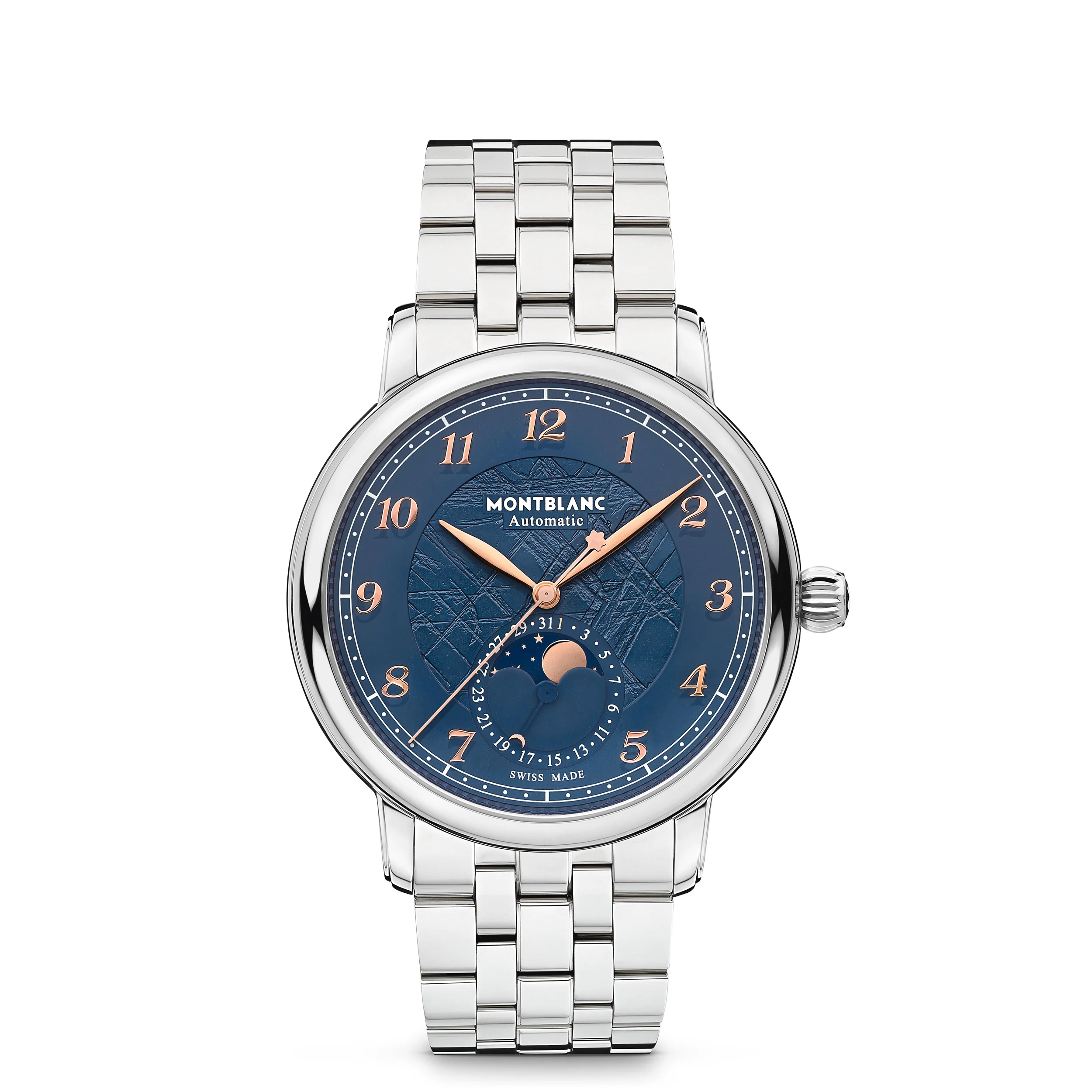 The Montblanc Star Legacy Moonphase is limited to 1786 pieces and comes in a 42mm pebble-shaped stainless steel case with rose gold-coated hands, Arabic numerals, and an eye-catching blue glacier pattern dial. The dial is decorated with a layered ice design that was inspired by the Mer de Glace, the main glacier of the Mont-Blanc Mountain. The center of the dial is created using a special stamp that reproduces this glacier texture and celebrates the "blue hour" - "l'heure bleue", during which a shade of intense blue falls upon the glacier at dusk when the moon rises and the stars begin to shine. It was at this time of day that Jacques Balmat became the first person to reach the summit of the Mont Blanc – at 18h23 on August 7th in, 1786. The functions include hours, minutes, central seconds with a Montblanc emblem on the counterweight, moonphase, and a date that are powered by the MB 24.31 automatic movement that can be admired through a sapphire crystal case back. The timepiece is paired with a stainless steel bracelet. Ident No. MB129631 Movement CALIBER Automatic, self-winding MOVEMENT TYPE Automatic movement Hour - Minute - Date - Moonphase COMPLICATIONS Date by hand; Moonphase display POWER RESERVE 50.0 h NUMBER OF JEWELS 25 Jewels Case CASE DIAMETER 1.65 inches CASE HEIGHT 0.45 inches WATER RESISTANT 5 bar (50 m) bar BEZEL Fixed BEZEL MATERIAL Stainless Steel SAPPHIRE CRYSTAL Sapphire crystal case back CROWN Stainless steel with Montblanc emblem DIAL Blue dial with glacier pattern and rose gold-coated Arabic numerals