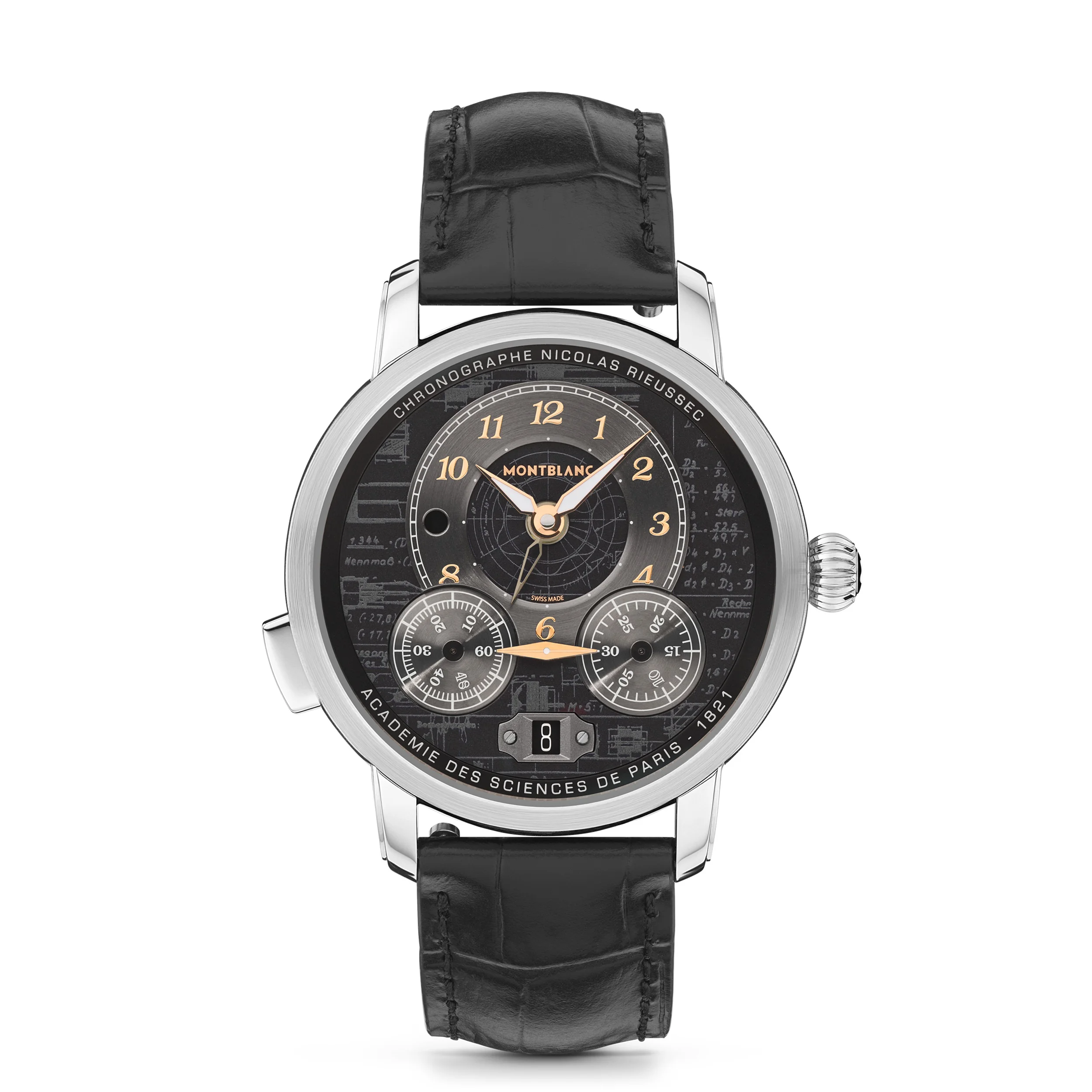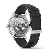 The Montblanc Star Legacy Nicolas Rieussec Chronograph celebrates 100 years of Montblanc’s famous Meisterstück writing instrument with design elements from the iconic fountain pen. Limited to 500 pieces, the timepiece comes in a 43 mm stainless steel case with an interchangeable black calf leather strap with alligator print. The black dial is adorned with luminescent printing that reveals a blueprint of the writing instrument dated from 1920 and plans from the dimension table from the Montblanc snowcapped emblem that can be found on the tip of every Meisterstück cap and on the crown of Montblanc timepieces. The significant 4810, intrinsically connected to Meisterstück can also be found on the dial, above the two rotating domed chronograph discs. A host of golden touches on the dial combined with the stainless steel of the case also recall the bicolour design of the Meisterstück’s nib. By turning the timepiece over, the oscillating weight of the Manufacture monopusher chronograph movement MB R200 can be observed through the caseback, revealing a nod to the world of handwriting with a delicate 8; a symbol inspired by calligraphy movements. The Montblanc Star Legacy Nicolas Rieussec Chronograph celebrates 100 years of Montblanc’s famous Meisterstück writing instrument with design elements from the iconic fountain pen. Limited to 500 pieces, the timepiece comes in a 43 mm stainless steel case with an interchangeable black calf leather strap with alligator print. The black dial is adorned with luminescent printing that reveals a blueprint of the writing instrument dated from 1920 and plans from the dimension table from the Montblanc snowcapped emblem that can be found on the tip of every Meisterstück cap and on the crown of Montblanc timepieces. The significant 4810, intrinsically connected to Meisterstück can also be found on the dial, above the two rotating domed chronograph discs. A host of golden touches on the dial combined with the stainless steel of the case also recall the bicolour design of the Meisterstück’s nib. By turning the timepiece over, the oscillating weight of the Manufacture monopusher chronograph movement MB R200 can be observed through the caseback, revealing a nod to the world of handwriting with a delicate 8; a symbol inspired by calligraphy movements. Ident No. MB133232 Movement FREQUENCY (VPH) 4 /h FREQUENCE (HZ) 28800,0 Hz Case CASE MATERIAL Stainless Steel CASE DIAMETER 1.69 inches CASE HEIGHT 0.59 inches WATER RESISTANT 5 bar (50 m) bar BEZEL Fixed BEZEL MATERIAL Stainless Steel SAPPHIRE CRYSTAL Sapphire crystal case back