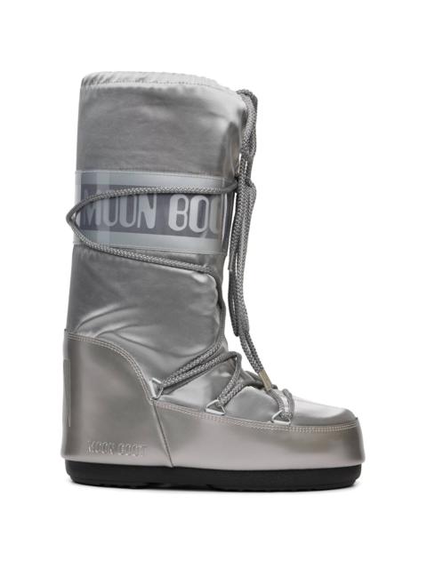 Mid-calf insulated buffed faux-leather and nylon canvas boots in navy. · Water-repellent · Lace-up closure · Drawstring at collar · Logo printed at sides and heel · Fleece lining · Lightweight rubber platform midsole · Treaded rubber sole · Platform: H2" Supplier color: Blue Upper: textile, synthetic. Sole: rubber. Made in Albania 251970M255045