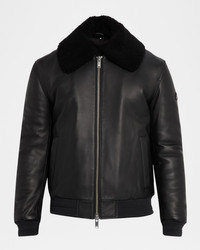 Moose Knuckles presents the ultimate piece for day or night. The "Toba Bomber Jacket" is crafted from luxurious lamb leather and features warm 100% recycled polyfill. Removable dyed shearling (China) collar Long sleeves; metal logo on the left arm Exposed twoway zipper Side zip pockets Banded cuffs and hem Lambskin leather Lining: Elastane/polyester Fill: Polyester Professional cleaning recommended Imported