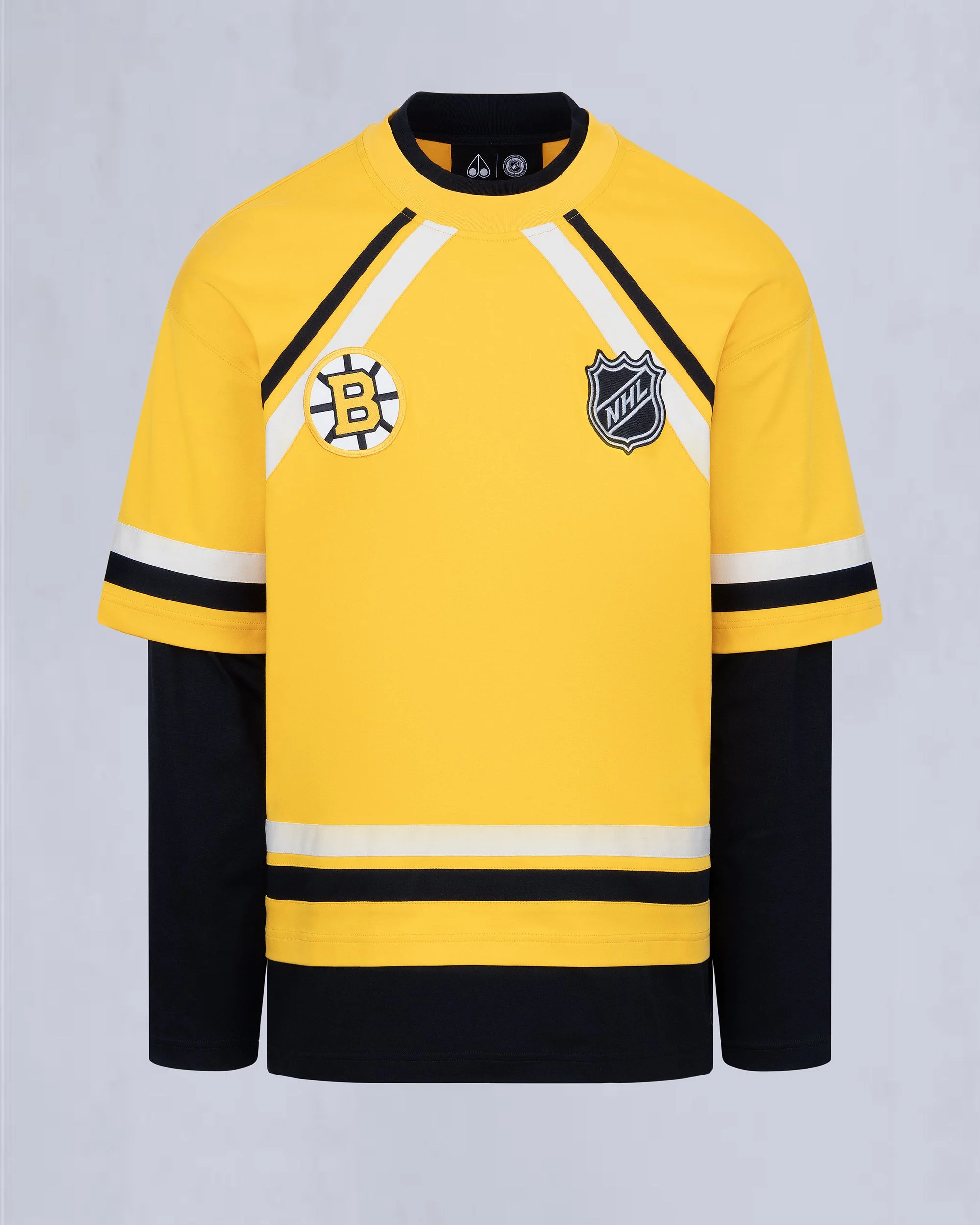 In honor of the NHL x Moose Knuckles partnership, we created a branded tee celebrating the Boston Bruins with their signature colorway. Size & Fit - Relaxed Fit : An easy and comfortable silhouette, cut with extra room on the body to allow for freedom of movement. It provides added shape, and it is comfortable. - 28"(71cm) Center Back Length. Measurement is done based on a Medium. Product Features Warmth & Protection - Engineered in Canada Design & Function - Double Rib Knit Collar - Boston Bruins Patch, Moose Team Patch, NHL Patch SKU: 822185899046 Materials & Care Composition - Body: 100% Cotton Care Dry Clean Only Country of Origin Made in China