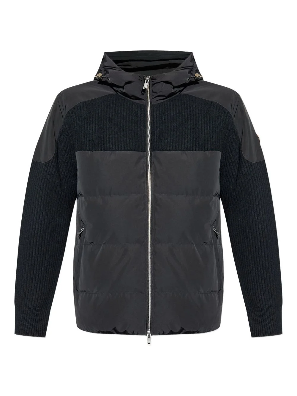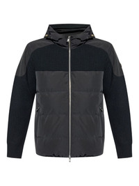 ribbed-panel quilted padded jacket Highlights - Black - Quilted panels - Ribbed wool sleeves - Hooded neckline - Zip front fastening - Logo patch Imported Composition Polyester 100%, Wool 100% Washing instructions Read Manufacturer Guidelines
