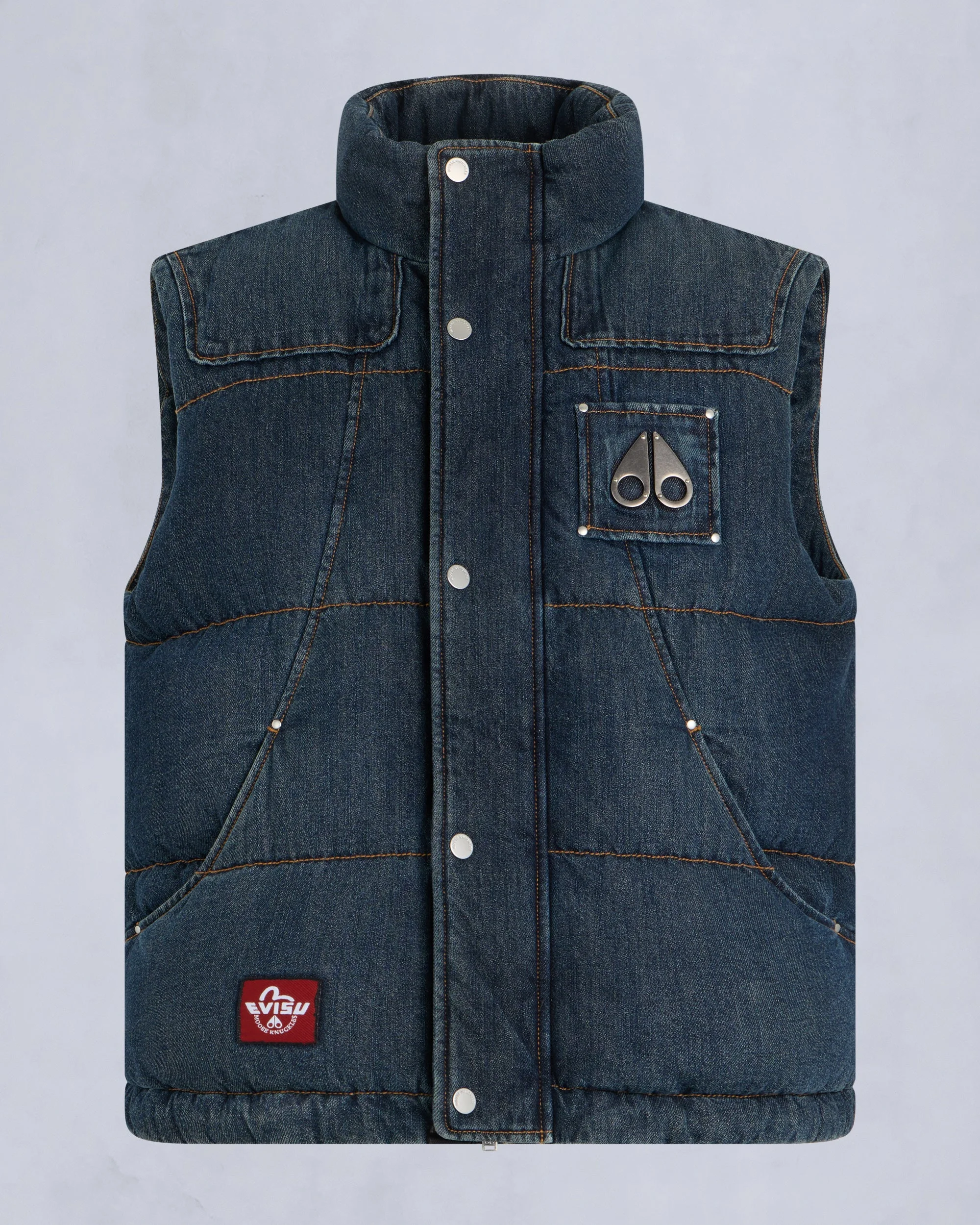 The Moose Knuckles x Evisu Collaboration reimagines Moose Knuckles’ iconic styles through Evisu’s premium Japanese denim and meticulous craftsmanship. The Everest Vest marries cozy warmth and Japanese street style—ideal for layering or wearing solo and perfect for transitioning from day to night. Size & Fit - Regular Fit : Regular is an understated silhouette, cut with room for movement throughout the chest and arms. It offers added agility without sacrificing structure and it comfortably accommodates midweight layers. Those who are in-between sizes or prefer extra room for layering may wish to size up. - Model is 6'0' wearing size M - 26"(66cm) Center Back Length. Measurement is done based on a Medium. Product Features Warmth & Protection - Protection Rating - Level 2: Cold – Your everyday winter workhorse. These garments will hold you down through the rain, sleet, hail and snow without overheating. - 800 Fill Power - Engineered in Canada, Water Repellent, Wind resistant Design & Function - Down Filled Collar - 2-Way Zipper with Logo Puller - 2 Pockets with Zipper Closure below Waist - Gunmetal Metal Logo SKU: 822185871615 Materials & Care Fill Responsible Down Standard Certified 90% Duck Down, 10% Feathers Composition - Body: 76% Nylon, 24% Elastane - Lining: 100% Nylon - RDS-Certified Care Machine Wash Cold Water Inside Out.Do Not Bleach.Tumble Dry Low Heat With Clean Tenis Balls. Garment To Be Fully Dried Before Removing It From The Dryer.Ironing Maximum Temperature 110°C - Without Steam.Dry Clean Inside Out - Mild Process. Country of Origin Made in China
