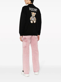 BLACK COTTON FINE KNIT INTARSIA-KNIT LOGO SIGNATURE TEDDY BEAR MOTIF STRIPED TIPPING RIBBED EDGE SPREAD COLLAR FRONT ZIP FASTENING LONG SLEEVES TWO SIDE SLASH POCKETS