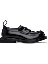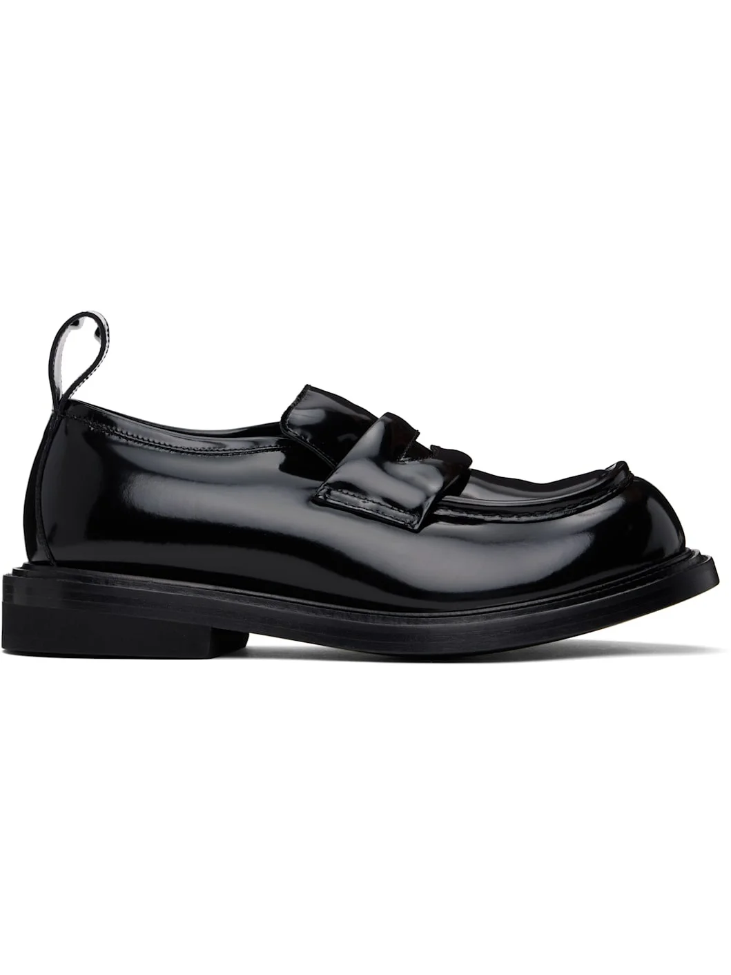 Padded patent leather loafers in black. · Moc toe · Strap with cutout at vamp · Padded tongue and collar · Pull-loop at heel tab · Topstitching at double-welt · Stacked leather and foam rubber block heel · Buffed leather lining · Leather sole Supplier color: Black Leather. Made in Italy 251720M231001