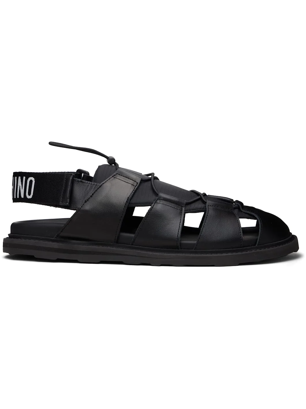 Buffed leather and ripstop sandals. · Cutouts throughout · Bungee-style drawstring at vamp · Logo-woven velcro strap at heel · Foam rubber midsole · Treaded rubber sole Supplier color: Black/Black Upper: leather, textile. Sole: rubber. Made in Spain 261720M234001