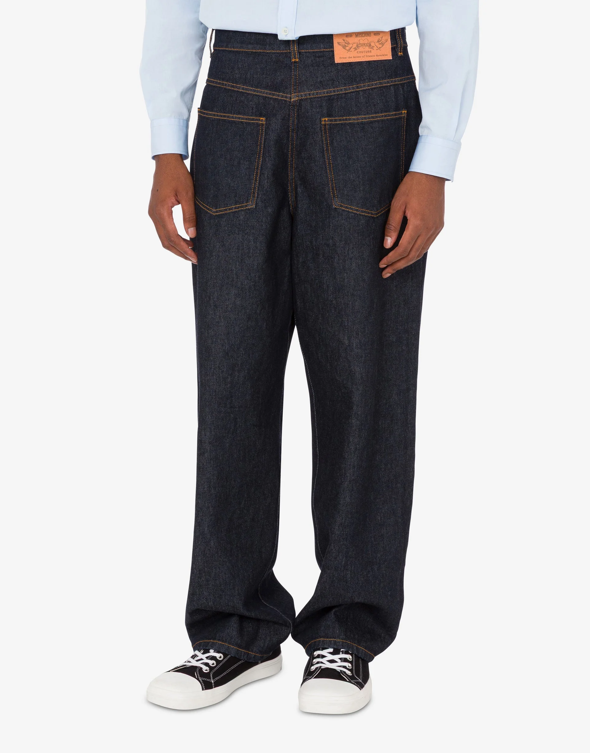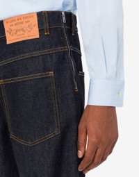 THE SPRING/SUMMER 2026 COLLECTION PRESENTS BLUE COTTON DENIM PANTS WITH AN EXPERIMENTAL DESIGN, FEATURING A FRONT THAT REPLICATES THE BACK AND PATCHES WITH THE SLOGAN “IN LOVE WE TRUST.” PRODUCT DETAILS LOOSE FIT - PATCHES APPLIED TO THE FRONT AND BACK - TWO FRONT POCKETS - BELT LOOPS AT THE WAIST - TWO BACK POCKETS - SIDE ZIP CLOSURE FABRIC: 100% COTTON SKU: AEF261ZZA030302430510