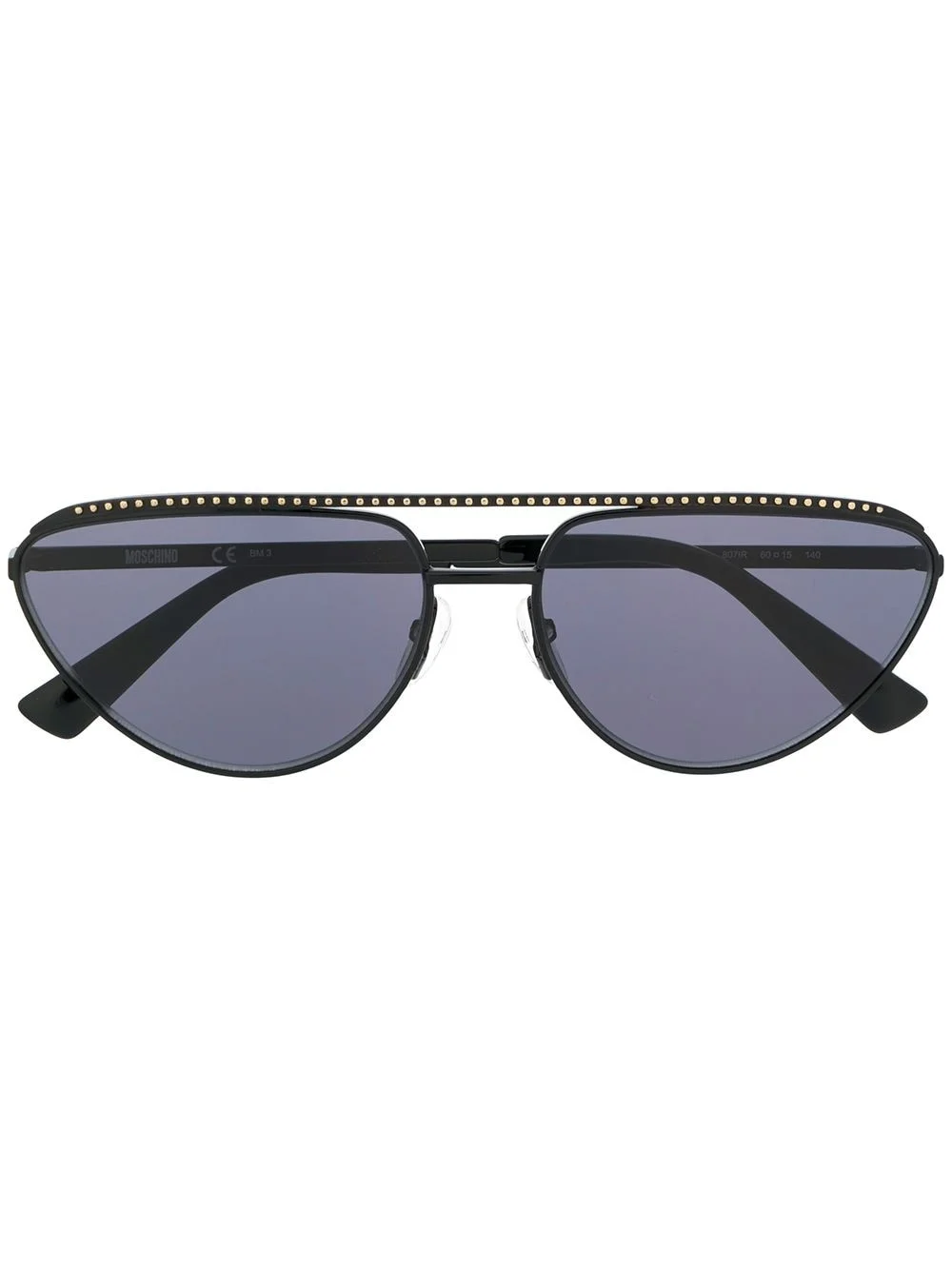cat eye sunglasses Black metal sunglasses from Moschino Eyewear featuring cat eye frames, dark tinted lenses and a double-bridged design. This item comes with a protective case. Imported Composition Metal (Other) 100% SIZE & FIT Measurement Arm Length 5.51 in(14 cm) Bridge Width 0.59 in(1.5 cm) Lens Diameter 2.36 in(6 cm) Total Width 5.51 in(14 cm)