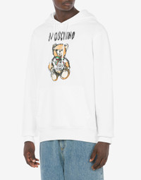 Organic cotton hoodie with logo print and drawn-effect Moschino Teddy Bear. - Slim fit - Print on the front - Drawstring hood - Dropped shoulders - Front pocket Fabric:100% Cotton Code: AEF241ZZ171602281001 FIT - Slim fit - Model bust size : 103 - Model height : 185 cm - Model Hips : 104 cm - Model size : 48 - Model waist : 84 cm