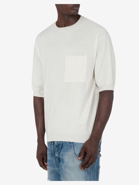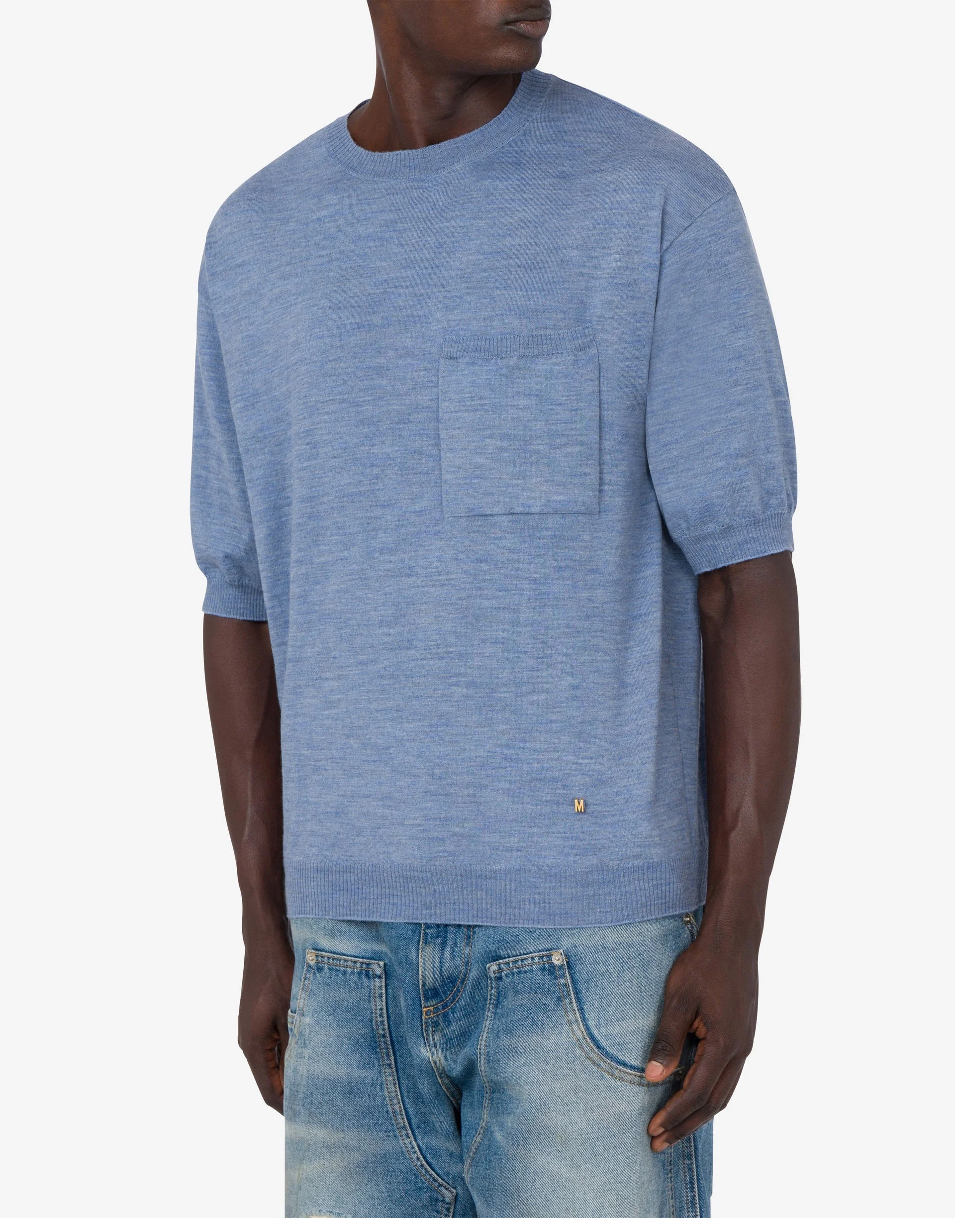 FINE WOOL AND SILK SWEATER WITH MINI MOSCHINO M IN GOLD GALVANIC. PRODUCT DETAILS RELAXED FIT - METAL LETTER M - CREW NECK - SHORT SLEEVES - FRONT POCKET FABRIC: 70% PURE WOOL, 30% SILK SKU: AEF251ZZA090602010307 FITTING & DIMENSIONS - MODEL HEIGHT: 185 CM - MODEL BUST: 103 CM - MODEL WAIST: 84 CM - MODEL HIPS: 104 CM - MODEL SIZE: 48