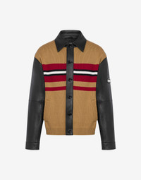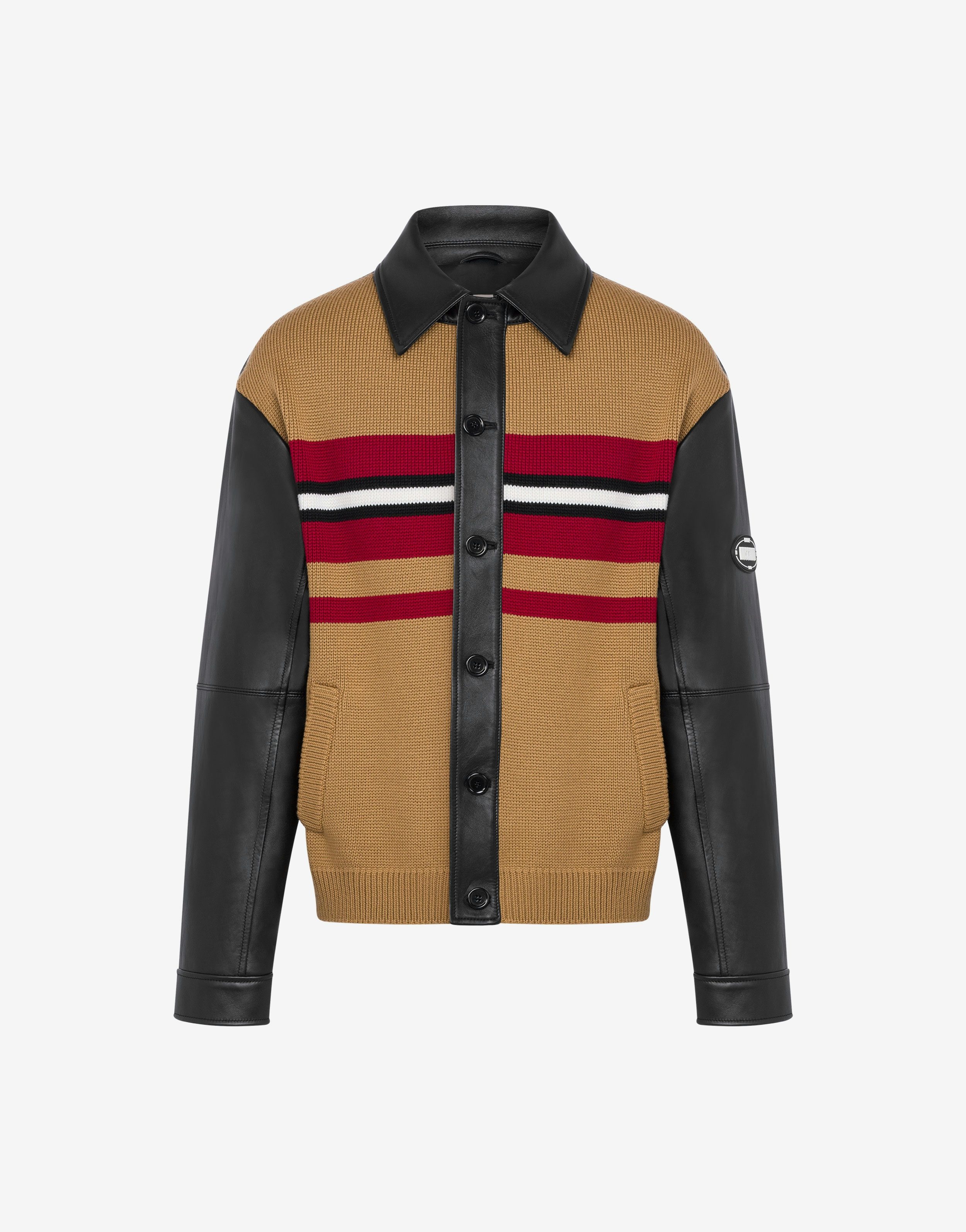 NAPPA LEATHER AND KNITTED JACKET WITH MULTICOLOUR STRIPED INLAYS AND RUBBERISED OVAL LOGO ON THE SLEEVE. REGULAR FIT DROPPED SHOULDERS TWO SIDE POCKETS FRONT BUTTON FASTENING FABRIC: 100% SHEEPSKIN LINING: 100% VISCOSE CODE: AEF242ZR370470703555