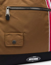 NYLON SHOPPER WITH CONTRASTING TWO-TONE STRIPED PATCHES, RUBBERISED CALFSKIN DETAILS AND LOGO ON THE FRONT. RUBBERISED LOGO STRIPED PATCHES ON BOTH SECTIONS REMOVABLE RIBBON SHOULDER STRAP ZIPPED POCKET ON THE FRONT SMALL POCKET WITH PRESS STUD LINED INTERIOR DIVIDED INTO TWO COMPARTMENTS BY A ZIPPED POCKET REAR COMPARTMENT WITH ZIPPED POCKET AND SMALL PATCH POCKET FABRIC: 10% ACRYLIC, 90% POLYAMIDE CODE: AEF242Z2747382282555 FIT DEPTH: 16 CM HEIGHT: 38 CM WIDTH: 34 CM